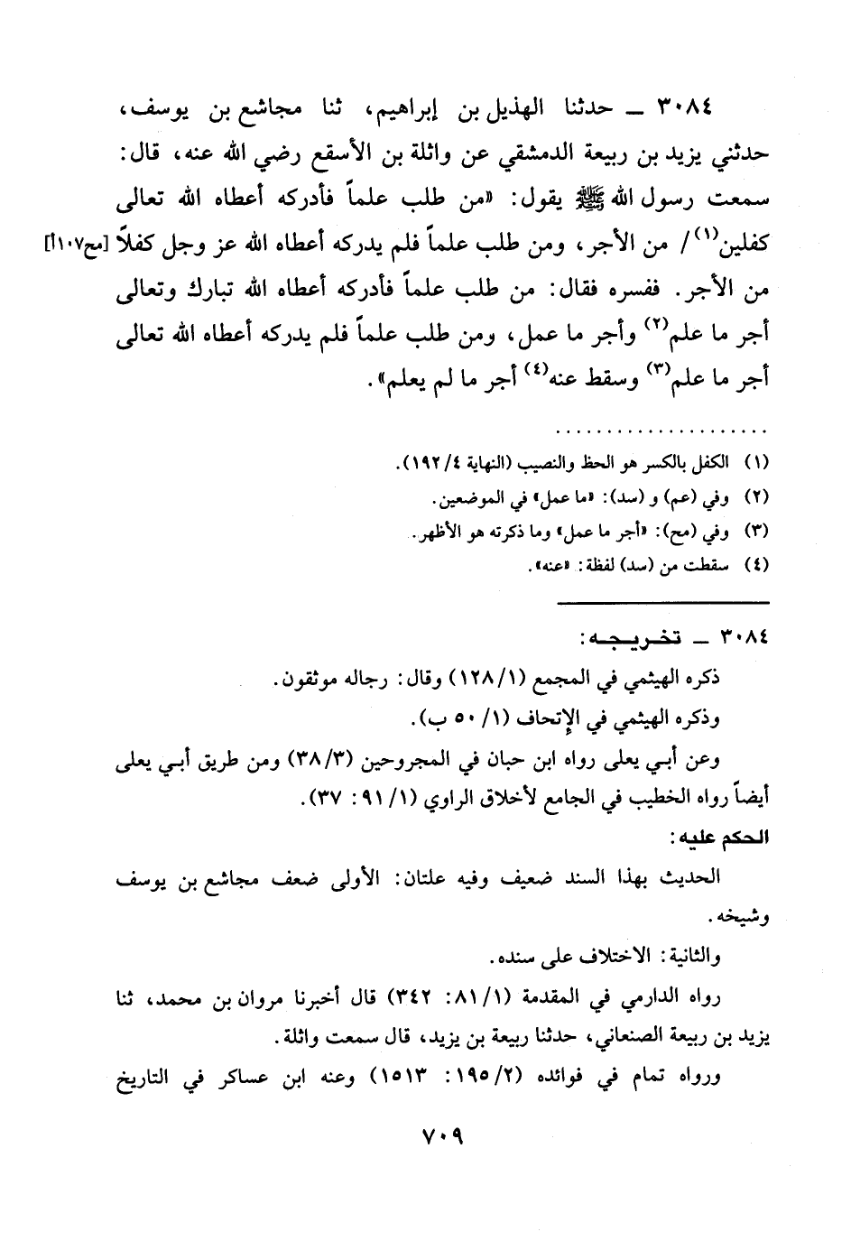 3084 - حدثنا الهُذَيْلُ بْنُ إِبْرَاهِيمَ، ثنا مُجَاشِعُ بْنُ يُوسُفَ حَدَّثَنِي يَزِيدُ بْنُ رَبِيعَةَ الدِّمَشْقِيُّ عَنْ وَاثِلَةَ بن الأسقع رَضِيَ الله عَنْه، قال: سَمِعْتُ رَسُولَ اللَّهِ صَلَّى اللَّهُ عَلَيْهِ وَسَلَّمَ يَقُولُ: " §مَنْ طَلَبَ عِلْمًا فَأَدْرَكَهُ أعطاه الله تعالى كِفْلَيْنِ مِنَ الْأَجْرِ، وَمَنْ طَلَبَ عِلْمًا يُدْرِكْهُ أعطاه الله عز وجل كِفْلًا مِنَ الْأَجْرِ. فَفَسَّرَهُ فَقَالَ: مَنْ طَلَبَ عِلْمًا فَأَدْرَكَهُ أعطاه الله تبارك وتعالى أَجْرَ مَا عَلِمَ وَأَجْرَ مَا عَمِلَ، وَمَنْ طَلَبَ عِلْمًا فَلَمْ يُدْرِكْهُ أعطاه الله تعالى أَجْرَ مَا علم وسقط عنه أَجْرُ مَا لَمْ يعلم ".