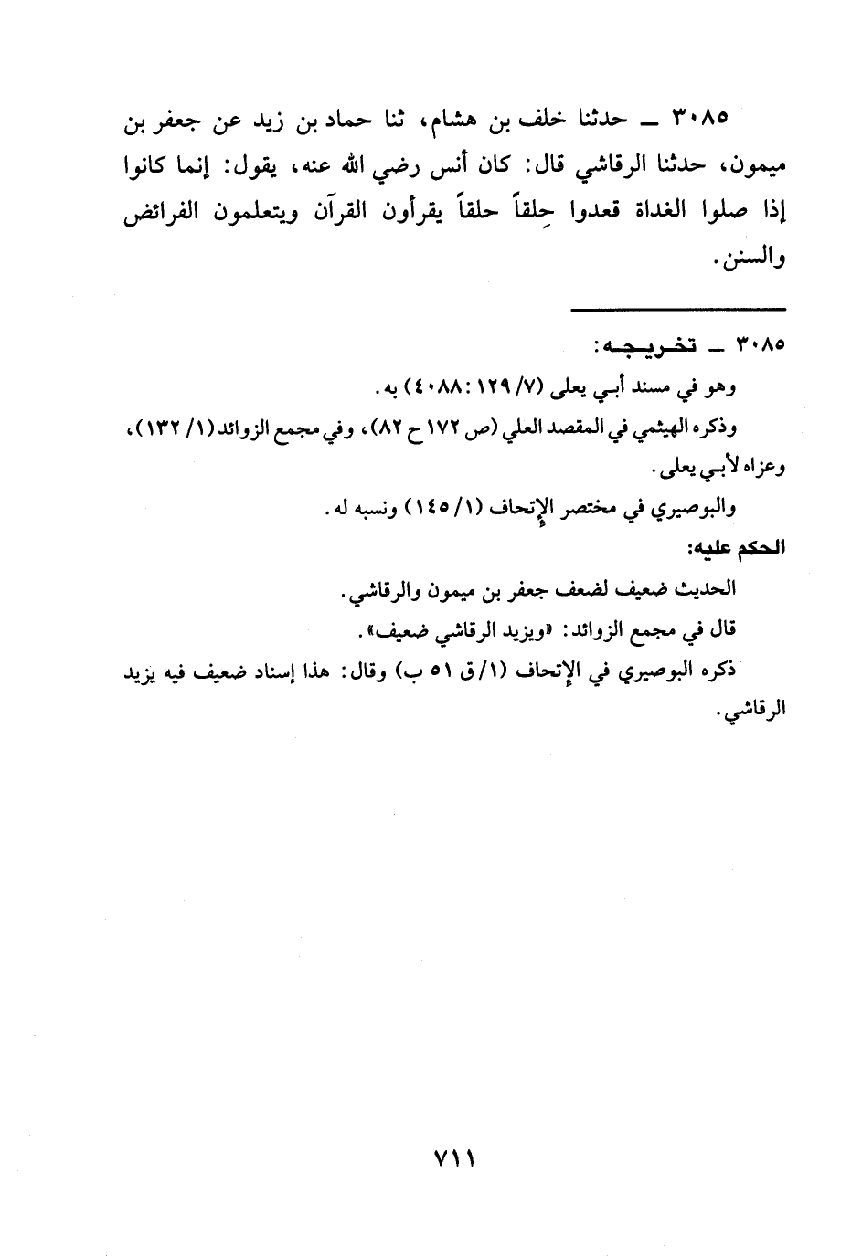 3085 - حدثنا خَلَفُ بْنُ هِشَامٍ، ثنا حَمَّادُ بْنُ زَيْدٍ عَنْ جَعْفَرِ بْنِ مَيْمُونٍ، حدثنا الرقاشي قال: كَانَ أَنَسٌ رَضِيَ الله عَنْه، يَقُولُ: إِنَّمَا كَانُوا §إِذَا صَلُّوا الْغَدَاةَ قعدوا حلقاً حِلَقًا يَقْرَأُونَ الْقُرْآنَ وَيَتَعَلَّمُونَ الفرائض وَالسُّنَنَ.