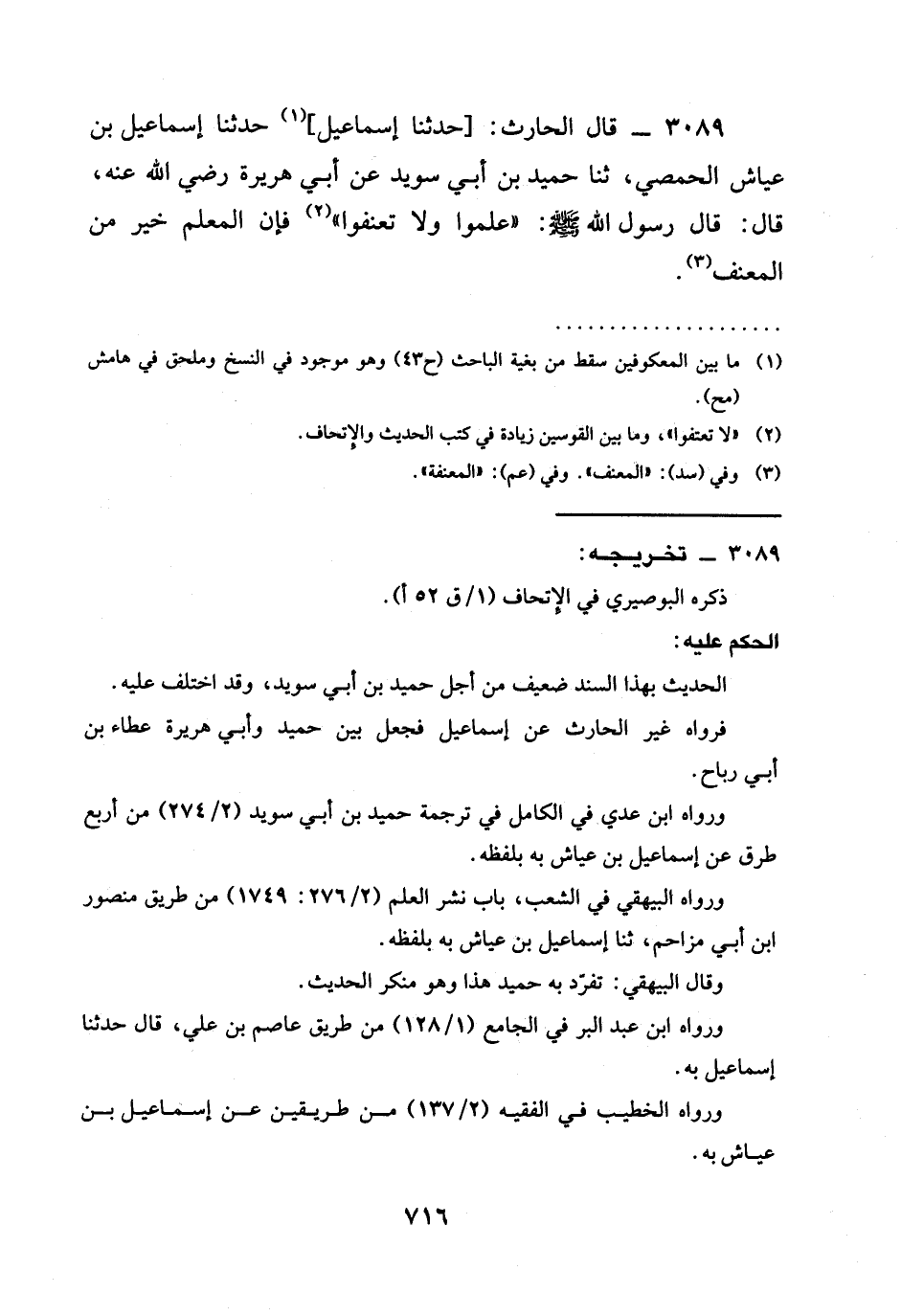 3089 - قَالَ الْحَارِثُ: [حدثنا إسماعيل] حدثنا إِسْمَاعِيلُ بْنُ عَيَّاشِ الْحِمْصِيُّ، ثنا حُمَيْدُ بْنُ أَبِي سُوَيْدٍ عَنْ أَبِي هُرَيْرَةَ رَضِيَ الله عَنْه، قَالَ: قَالَ رَسُولُ اللَّهِ صَلَّى اللَّهُ عَلَيْهِ وَسَلَّمَ: " §عَلِّمُوا وَلَا تُعَنِّفُوا " فَإِنَّ الْمُعَلِّمَ خَيْرٌ مِنَ الْمُعَنِّفِ.