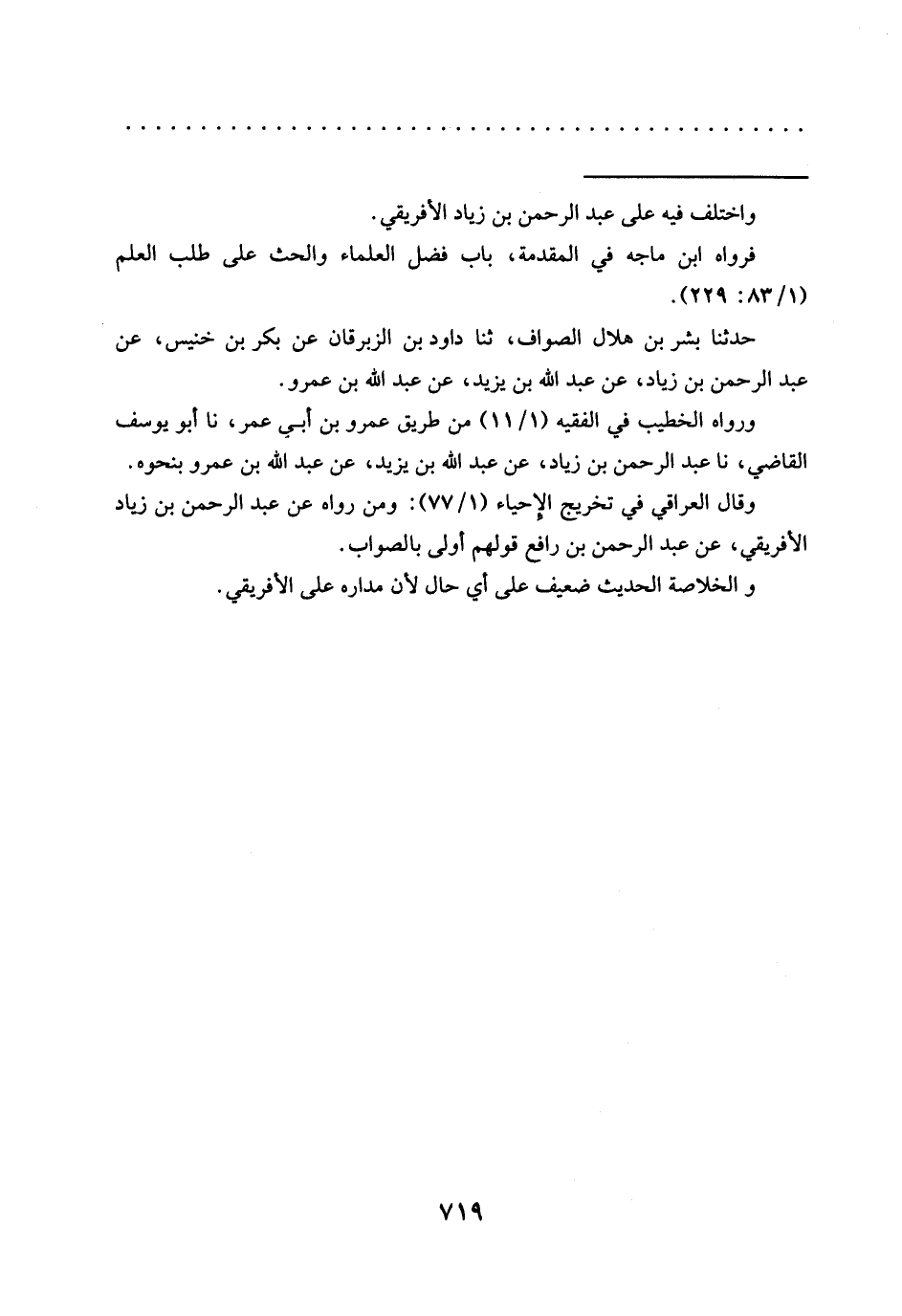 وقال العراقي في تخريج الإحياء (1/ 77): ومن رواه عن عبد الرحمن بن زياد الأفريقي، عن عبد الرحمن بن رافع قولهم أولى بالصواب.