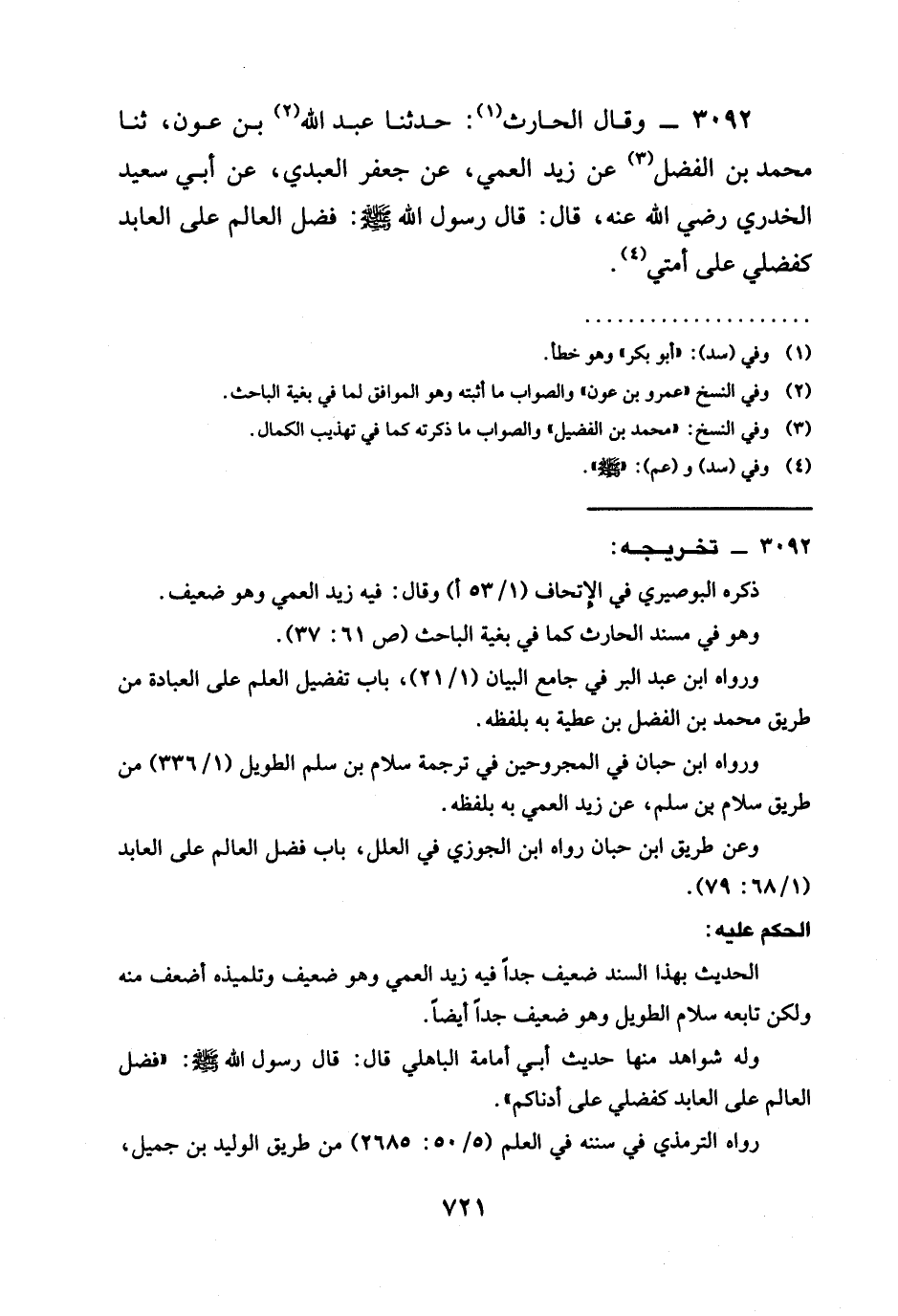 3092 - وقال الْحَارِثُ: حدثنا عَبْدُ اللَّهِ بْنُ عَوْنٍ، ثنا مُحَمَّدُ بْنُ الْفَضْلِ عَنْ زَيْدٍ الْعَمِّيِّ، عَنْ جَعْفَرٍ الْعَبْدِيِّ، عَنْ أَبِي سَعِيدٍ الْخُدْرِيِّ رَضِيَ الله عَنْه، قَالَ: قَالَ رَسُولُ اللَّهِ صَلَّى اللَّهُ عَلَيْهِ وَسَلَّمَ: §فَضْلُ الْعَالِمِ عَلَى الْعَابِدِ كَفَضْلِي عَلَى أُمَّتِي.