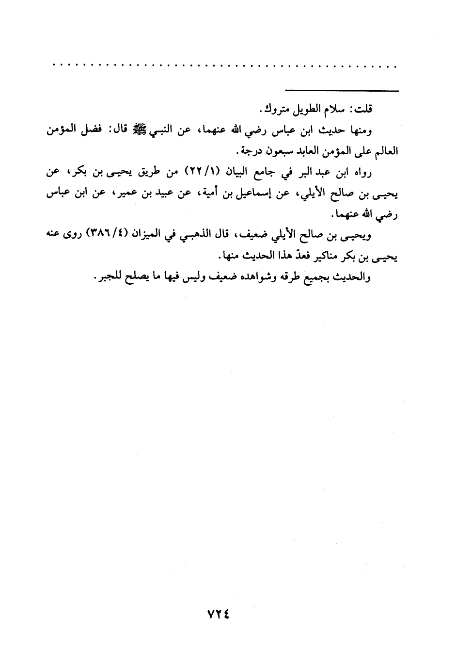 ومنها حديث ابن عباس رضي الله عنهما، عَنِ النَّبِيِّ -صَلَّى اللَّهُ عَلَيْهِ وَسَلَّمَ- قَالَ: فضل المؤمن العالم على المؤمن العابد سبعون درجة.