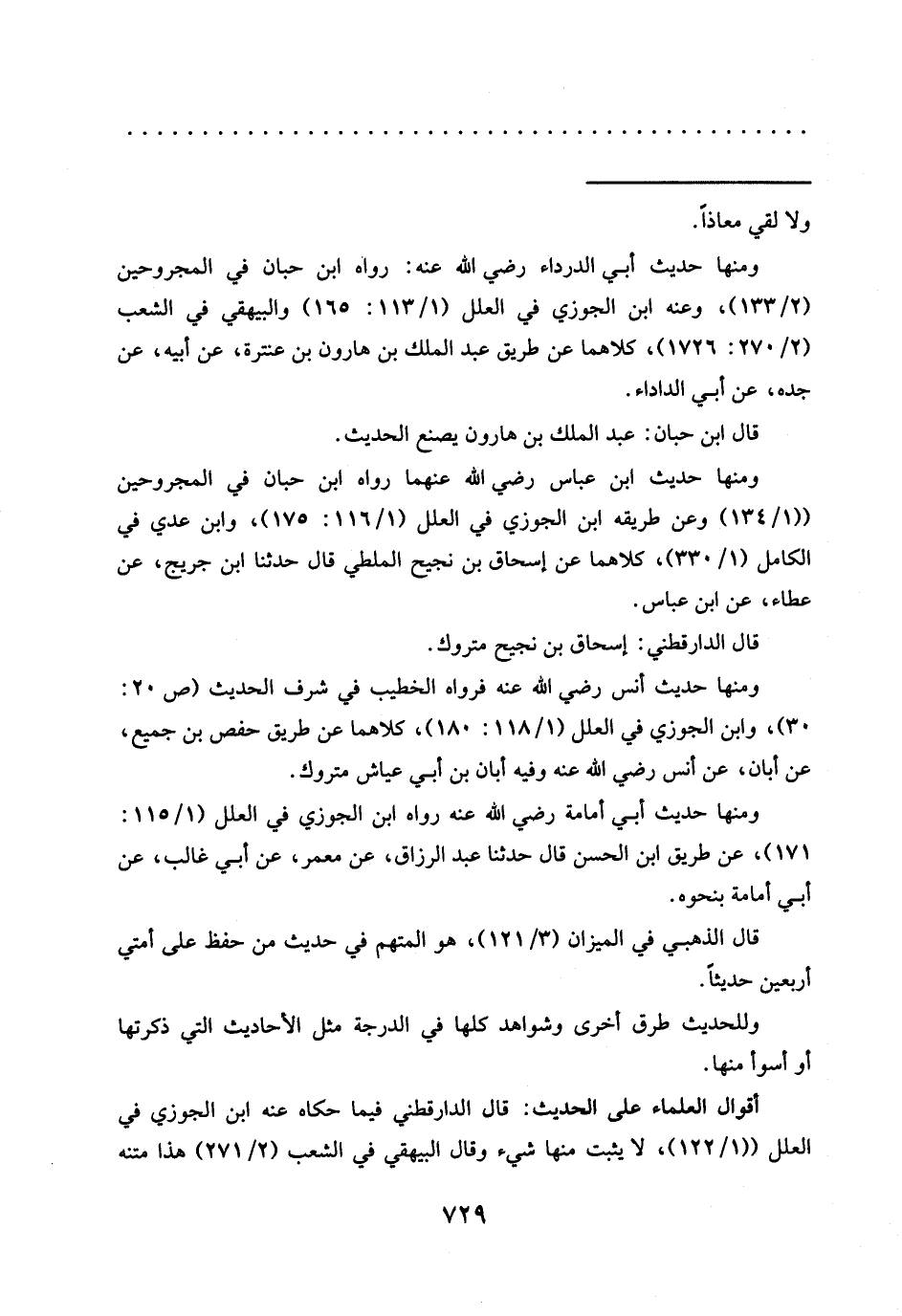 ومنها حديث ابن عباس رضي الله عنهما رواه ابن حبّان في المجروحين ((1/ 134) وعن طريقه ابن الجوزي في العلل (1/ 116: 175)، وابن عديّ في الكامل (1/ 330)، كلاهما عن إسحاق بن نجيح الملطي قال حدّثنا ابْنِ جُرَيْجٍ، عَنْ عَطَاءٍ، عَنِ ابْنِ عَبَّاسٍ.