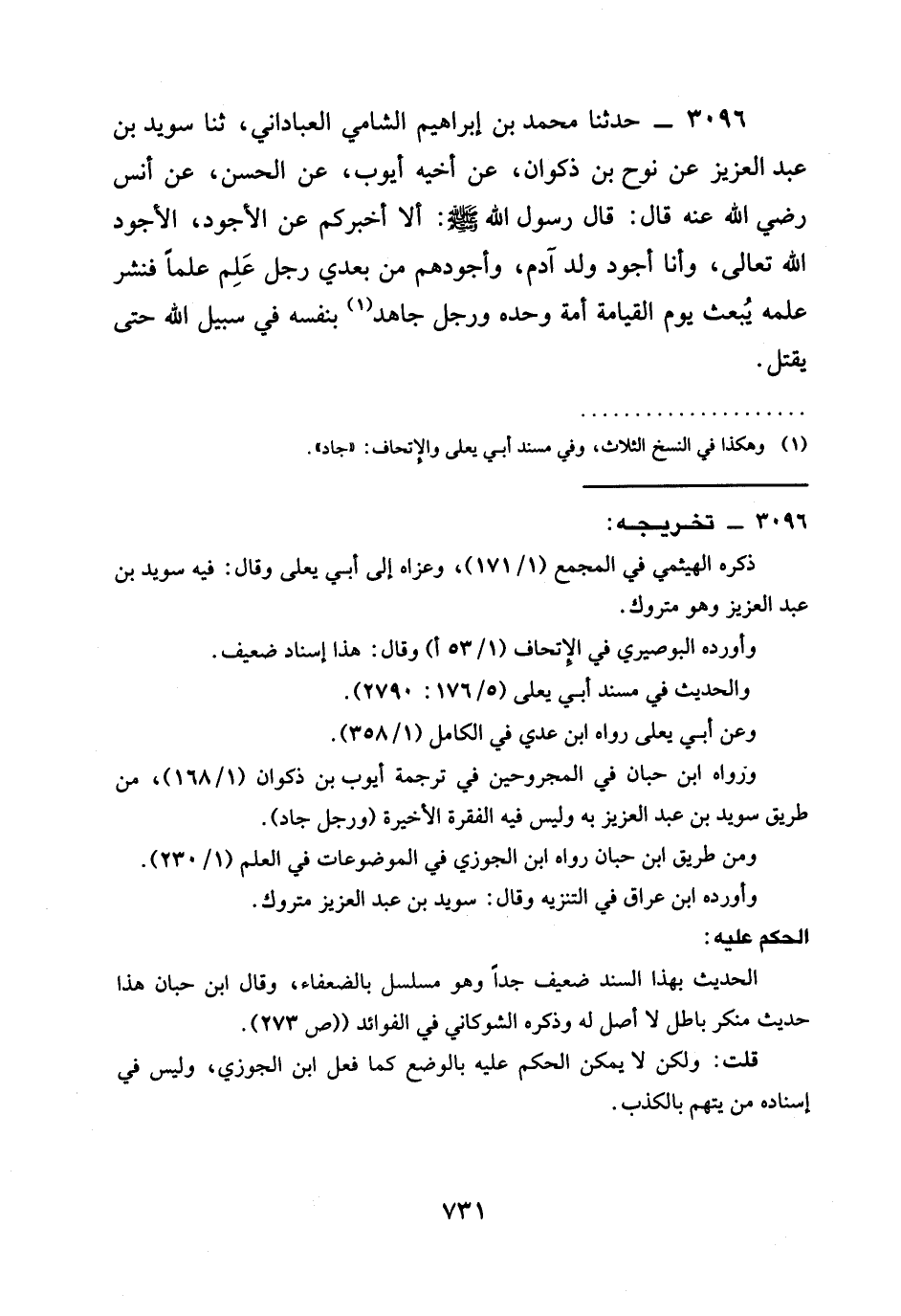 3096 - حدثنا مُحَمَّدُ بْنُ إِبْرَاهِيمَ الشامي الْعَبَّادَانِيُّ، ثنا سُوَيْدُ بْنُ عَبْدِ الْعَزِيزِ عَنْ نُوحِ بْنِ ذَكْوَانَ عَنْ أَخِيهِ أَيُّوبَ، عَنِ الْحَسَنِ، عَنْ أَنَسٍ رَضِيَ الله عَنْه قَالَ: قَالَ رَسُولُ اللَّهِ صَلَّى اللَّهُ عَلَيْهِ وَسَلَّمَ: أَلَا أُخْبِرُكُمْ عَنِ الْأَجْوَدِ، الأجود الله تعالى، وَأَنَا أَجْوَدُ وَلَدِ آدَمَ، §وَأَجْوَدُهُمْ مِنْ بَعْدِي رَجُلٌ عَلِمَ عِلْمًا فَنَشَرَ عِلْمَهُ يُبْعَثُ يَوْمَ الْقِيَامَةِ أُمَّةً وحده ورجل جاهد بَنَفْسِهِ فِي سَبِيلِ اللَّهِ حَتَّى يُقْتَلَ.