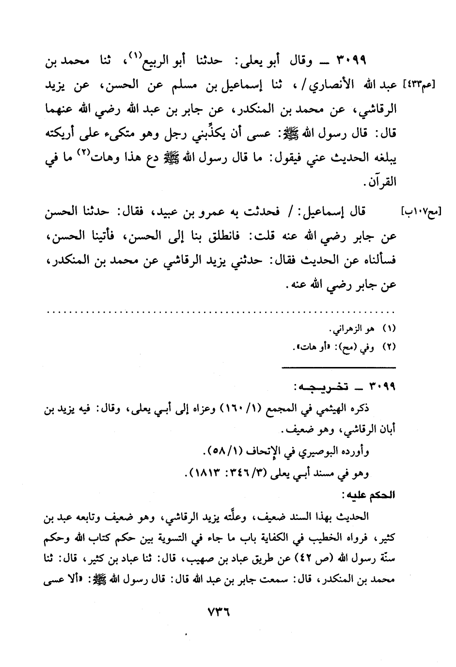 3099 - وقال أَبُو يَعْلَى: حدثنا أَبُو الرَّبِيعِ، ثنا مُحَمَّدُ بْنُ عَبْدِ اللَّهِ الْأَنْصَارِيُّ /، ثنا إِسْمَاعِيلُ بْنُ مُسْلِمٍ عَنِ الْحَسَنِ، عَنْ يَزِيدَ الرَّقَاشِيِّ، عَنْ مُحَمَّدِ بْنِ الْمُنْكَدِرِ، عَنْ جَابِرِ بْنِ عبد الله رَضِيَ الله عَنْهما قَالَ: قَالَ رَسُولُ اللَّهِ صَلَّى اللَّهُ عَلَيْهِ وَسَلَّمَ: §عَسَى أَنْ يُكَذِّبَنِي رَجُلٌ وَهُوَ مُتَّكِئٌ عَلَى أَرِيكَتِهِ يَبْلُغُهُ الحديث عني فيقول: مَا قَالَ رَسُولُ اللَّهِ صَلَّى اللَّهُ عَلَيْهِ وَسَلَّمَ دَعْ هَذَا وَهَاتِ مَا فِي الْقُرْآنِ.؟