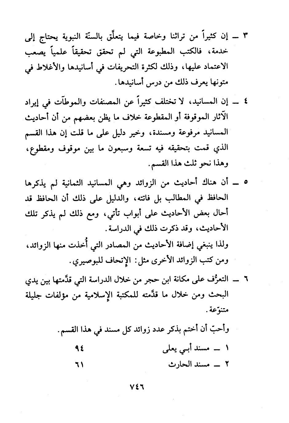 5 - أن هناك أحاديث من الزوائد وهي المسانيد الثمانية لم يذكرها الحافظ في المطالب بل فاتته، والدليل على ذلك أن الحافظ قد أحال بعض الأحاديث على أبواب تأتي، ومع ذلك لم يذكر تلك الأحاديث، وقد ذكرت ذلك في الدراسة.