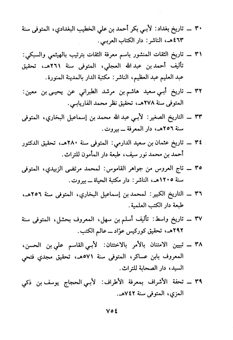 31 - تاريخ الثقات المنشور باسم معرفة الثقات بترتيب بالهيثمي والسبكي: تأليف أحمد بن عبد الله العجلي، المتوفَّى سنة 261هـ، تحقيق عبد العليم عبد العظيم، الناشر: مكتبة الدار بالمدينة المنورة.