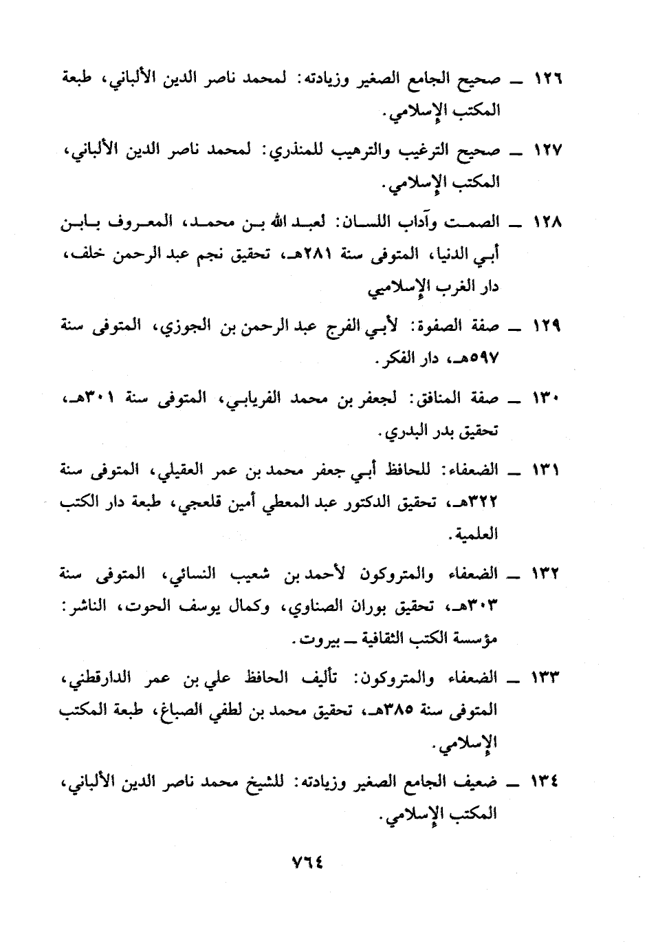 132 - الضعفاء والمتروكون لأحمد بن شعيب النسائيُّ، المتوقى سنة 303 هـ، تحقيق بوران الصناوي، وكمال يوسف الحوت، الناشر: مؤسسة الكتب الثقاقية- بيروت.