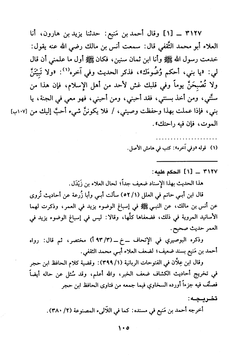 2127 -[1] وقال أَحْمَدُ بْنُ مَنِيعٍ: حدثنا يَزِيدُ بْنُ هَارُونَ، أنا الْعَلَاءُ أَبُو محمد الثَّقفي قال: سَمِعْتُ أَنَسَ بْنَ مَالِكٍ رَضِيَ الله عَنْه يَقُولُ: خَدَمْتُ رَسُولَ اللَّهِ صَلَّى اللَّهُ عَلَيْهِ وَسَلَّمَ وَأَنَا ابْنُ ثَمَانِ سِنِينَ، فَكَانَ صَلَّى اللَّهُ عَلَيْهِ وَسَلَّمَ أَوَّلُ مَا عَلَّمَنِي أَنْ قَالَ لِي: " يَا بُنَيَّ، أَحْكِمْ وُضُوءَكَ "، فَذَكَرَ الْحَدِيثَ وَفِي آخره: " ولا تَبِيْتَنَّ ولا تُصْبِحَنَّ يَوْمًا وَفِي قَلْبِكَ غِشٌّ لِأَحَدٍ مِنْ أَهْلِ الْإِسْلَامِ، فَإِنَّ هَذَا مِنْ سُنَّتِي، وَمَنْ أَخَذَ بِسُنَّتِي، فقد أحبني، ومن أَحَبَّنِي، فَهُوَ مَعِي فِي الْجَنَّةِ، يَا بُنَيَّ، فَإِذَا علمت بِهَذَا وَحَفِظْتَ وَصِيَّتِي، / §فَلَا يَكُونَنَّ شَيْءٌ أَحَبَّ إِلَيْكَ مِنَ الْمَوْتِ، فَإِنَّ فِيهِ رَاحَتَكَ -[113]- ".