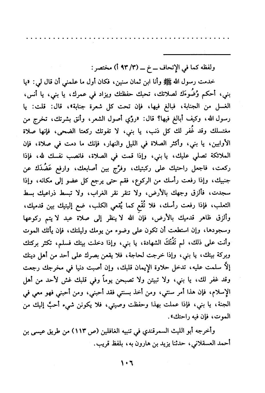 خَدَمْتُ رَسُولَ اللَّهِ -صَلَّى اللَّهُ عَلَيْهِ وَسَلَّمَ- وَأَنَا ابْنُ ثَمَانِ سِنِينَ، فَكَانَ أَوَّلُ مَا عَلَّمَنِي أَنْ قَالَ لِي: "يَا بُنَيَّ، أَحْكِمْ وُضُوءَك لصلاتك، تحبك حفظتك ويزاد في عمرك، يا بني، يا أنس، الغسل من الجنابة، فبالغ فيها، فإن تحت كل شعرة جنابة"، قال: قلت: يا رسول الله، وكيف أبالغ فيها؟ قال: "روِّي أصول الشعر، وأنق بشرتك، تخرج من مغتسلك وقد غُفر لك كل ذنب، يا بني، لا تفوتك ركعتا الضحى، فإنها صلاة الأوابين، يا بني، وكثر الصلاة في الليل والنهار، فإنك ما دمت في صلاة، فإن الملائكة تصلي عليك، يا بني، وإذا قمت في الصلاة، فانصب نفسك لله، فإذا ركعت، فاجعل راحتيك على ركبتيك، وفرّج بين أصابعك، وارفع عَضُدَك عن جنبيك، وإذا رفعت رأسك من الركوع، فقم حتى يرجع كل عضو إلى مكانه، وإذا سجدت، فألزق وجهك بالأرض، ولا تنقر نقر الغراب، ولا تبسط ذراعيك بسط الثعلب، فإذا رفعت رأسك، فلا تُقْعِ كما يُقعي الكلب، ضع إليتيك بين قدميك، وألزق ظاهر قدميك بالأرض، فإن الله لا ينظر إلى صلاة عبد لا يتم ركوعها وسجودها، وإن استطعت أن تكون على وضوء من يومك وليلتك، فإن يأتك الموت وأنت على ذلك، لم تَفُتْكَ الشهادة، يا بني، وإذا دخلت بيتك فسلم، تكثر بركتك وبركة بيتك، يا بني، وإذا خرجت لحاجة، فلا يقعن بصرك على أحد من أهل دينك إلّا سلمت عليه، تدخل حلاوة الإيمان قلبك، وإن أصبت دنيا في مخرجك رجعت وقد غفر لك، يا بني، ولا تبيتن ولا تصبحن يَوْمًا وَفِي قَلْبِكَ غِشٌّ لِأَحَدٍ مِنْ أَهْلِ الإِسلام، فإن هذا أمر سنتي، ومن أخذ بسنتي فقد أحبني، ومن أَحَبَّنِي فَهُوَ مَعِي فِي الْجَنَّةِ، يَا بُنَيَّ، فَإِذَا عَمِلْتَ بِهَذَا وَحَفِظْتَ وَصِيَّتِي، فَلَا يَكُونَنَّ شَيْءٌ أَحَبَّ إِلَيْكَ مِنَ الْمَوْتِ، فَإِنَّ فِيهِ راحتك".