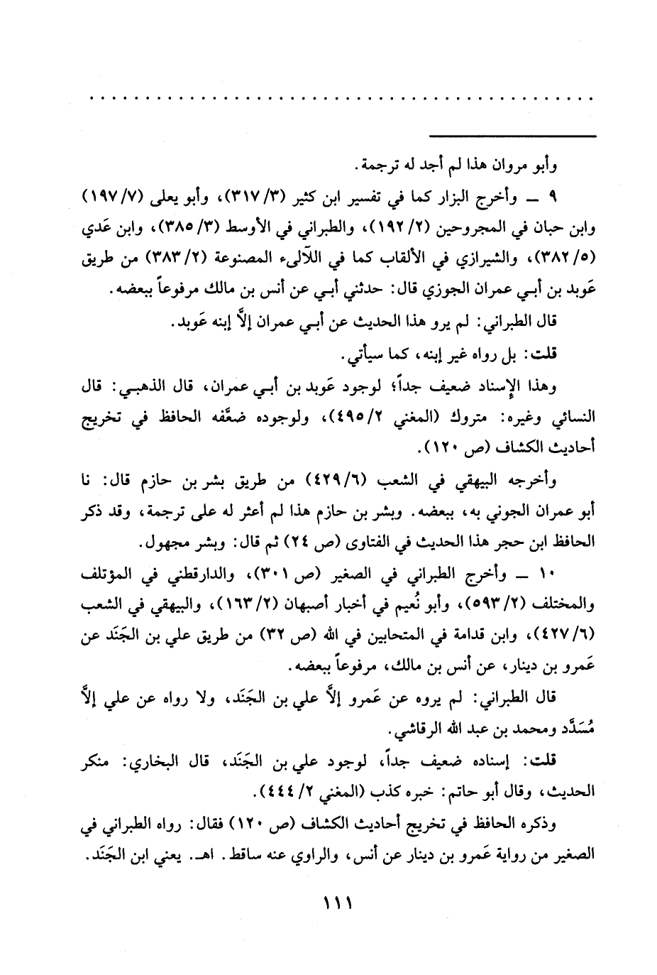 9 - وأخرج البزّار كما في تفسير ابن كثير (3/ 317)، وأبو يعلى (7/ 197) وابن حبّان في المجروحين (2/ 192)، والطبراني في الأوسط (3/ 385)، وابن عَدي (5/ 382)، والشيرازي في الألقاب كما في اللآلئ المصنوعة (2/ 383) من طريق عَوبد بن أبي عمران الجوزي قال: حدثني أبي عن أنس بن مالك مرفوعًا ببعضه.