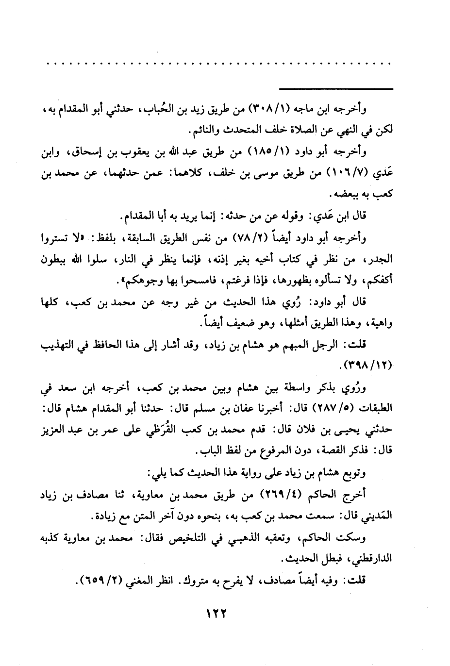 ورُوي بذكر واسطة بين هشام وبين محمَّد بن كعب، أخرجه ابن سعد في الطبقات (5/ 287) قال: أخبرنا عفان بن مسلم قال: حدّثنا أبو المقدام هشام قال: حدثني يحيى بن فلان قال: قدم محمَّد بن كعب القُرَظي على عمر بن عبد العزيز قال: فذكر القصة، دون المرفوع من لفظ الباب.