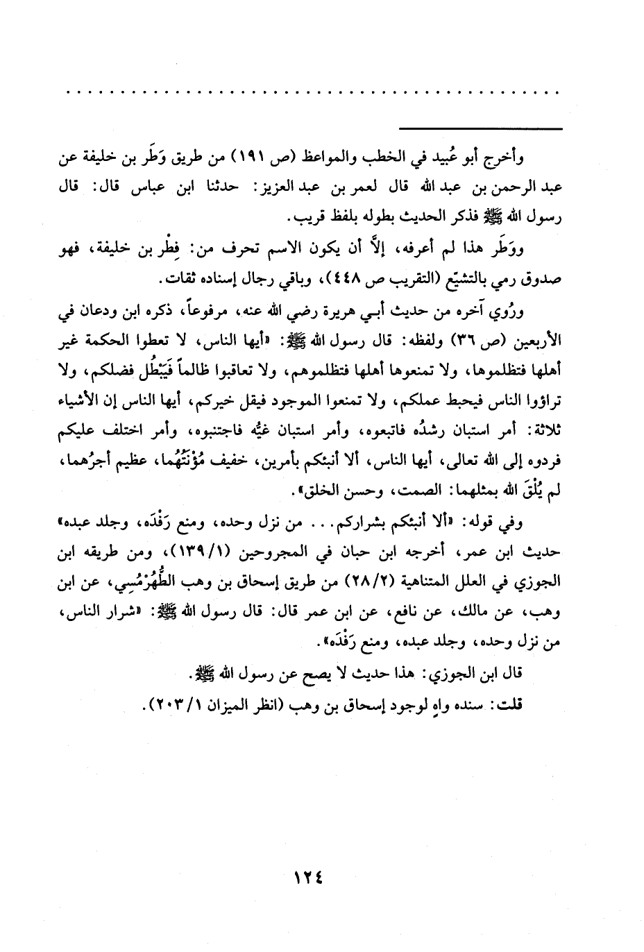 وفي قوله: "ألا أنبئكم بشراركم ... مَنْ نَزَلَ وَحْدَهُ، وَمَنَعَ رَفْدَه، وَجَلَدَ عَبْدَهُ" حديث ابن عمر، أخرجه ابن حبّان في المجروحين (1/ 139)، ومن طريقه ابن الجوزي في العلل المتناهية (2/ 28) من طريق إسحاق بن وهب الطُّهُرْمُسِي، عن ابن وهب، عَنْ مَالِكٍ، عَنْ نَافِعٍ، عَنِ ابْنِ عُمَرَ قَالَ: قَالَ رَسُولُ اللَّهِ -صَلَّى اللَّهُ عَلَيْهِ وسلم-: "شرار الناس، من نزل وحده، وجلد عبده، ومنع رَفْدَه".