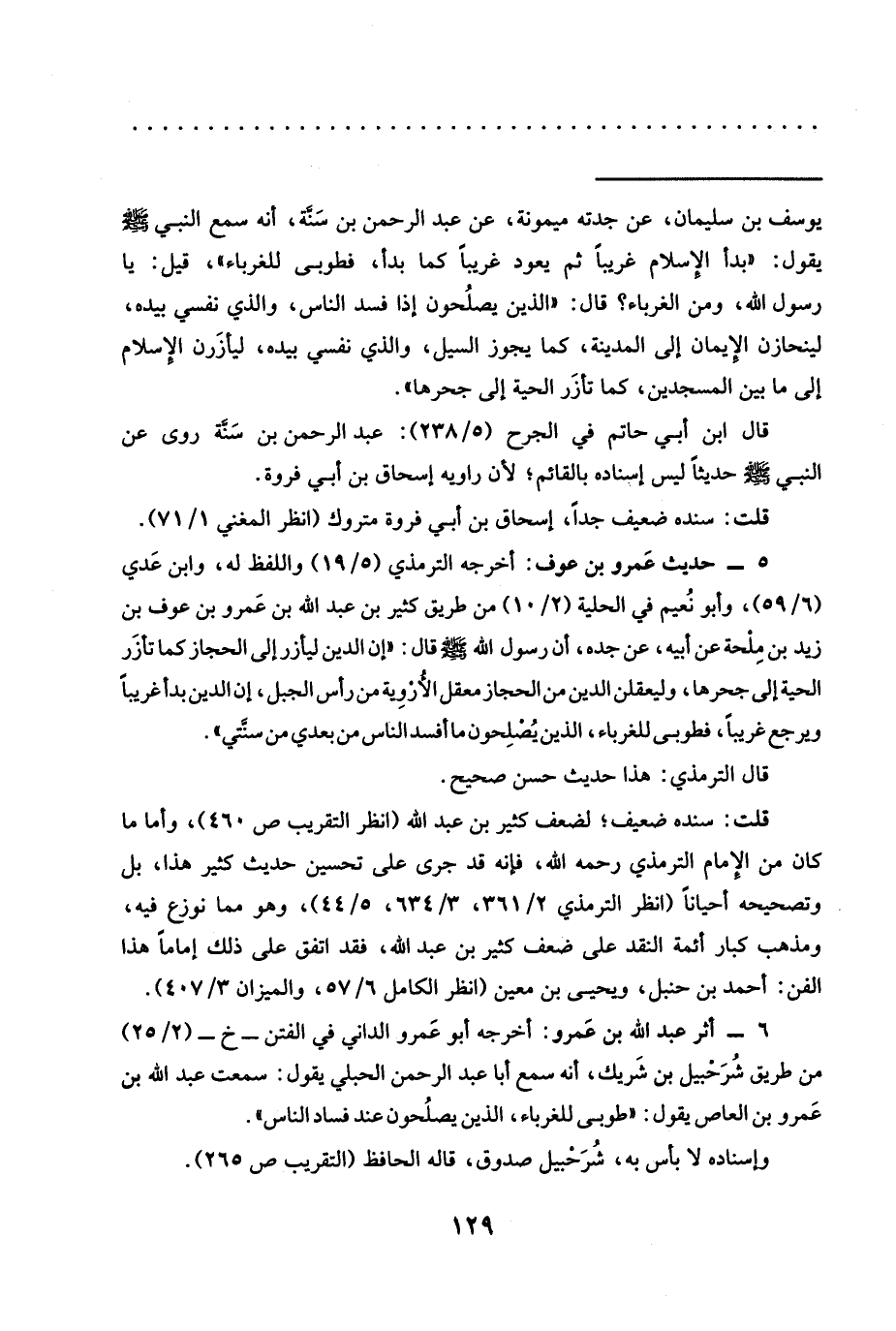 6 - أثر عبد الله بن عَمرو: أخرجه أبو عَمرو الداني في الفتن -خ- (2/ 25) من طريق شُرَحْبيل بن شَريك، أنه سمع أبا عبد الرحمن الحبلي يقول: سمعت عبد الله بن عَمرو بن العاص يقول: "طوبى للغرباء، الذين يصلُحون عند فساد الناس".