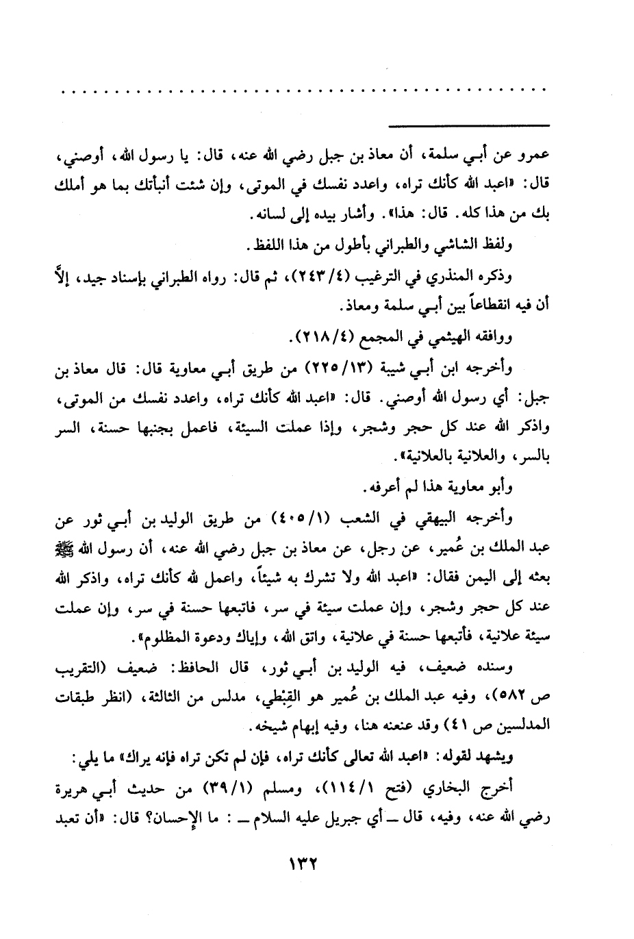 ويشهد لقوله: "اعبد الله تعالى كَأَنَّكَ تَرَاهُ، فَإِنْ لَمْ تَكُنْ تَرَاهُ فَإِنَّهُ يراك" ما يلي: أخرج البخاريُّ (فتح 1/ 114)، ومسلم (1/ 39) مِنْ حَدِيثِ أَبِي هُرَيْرَةَ رَضِيَ اللَّهُ عَنْهُ، وفيه، قال -أي جبريل عليه السلام -: ما الإحسان؟ قال: "أن تعبد =