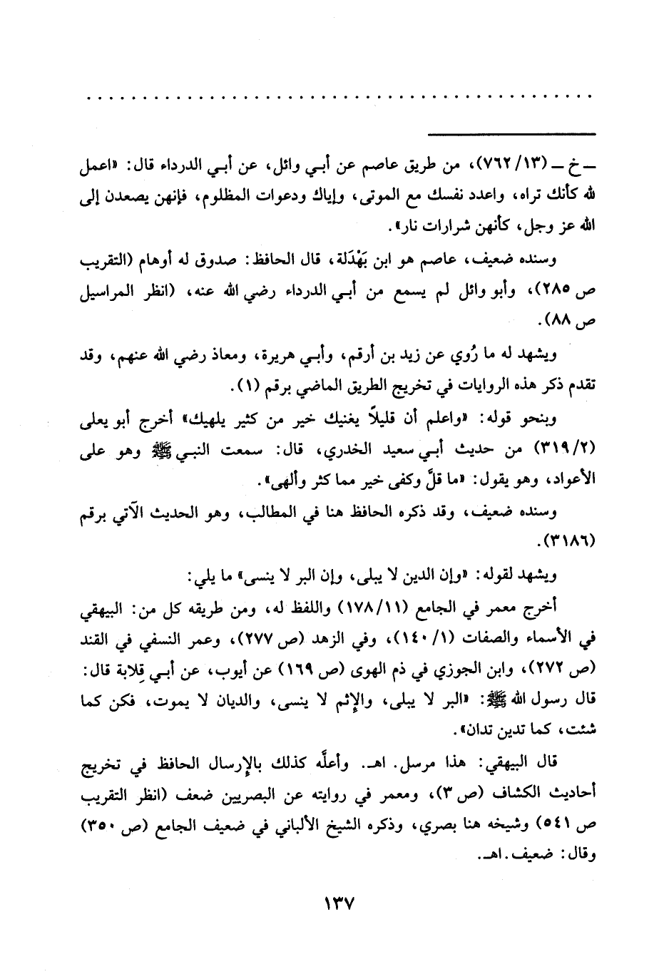 وسنده ضعيف، عاصم هو ابن بَهْدَلة، قال الحافظ: صدوق له أوهام (التقريب ص 285)، وأبو وائل لم يسمع من أبي الدرداء رضي الله عنه، (انظر المراسيل ص 88).
