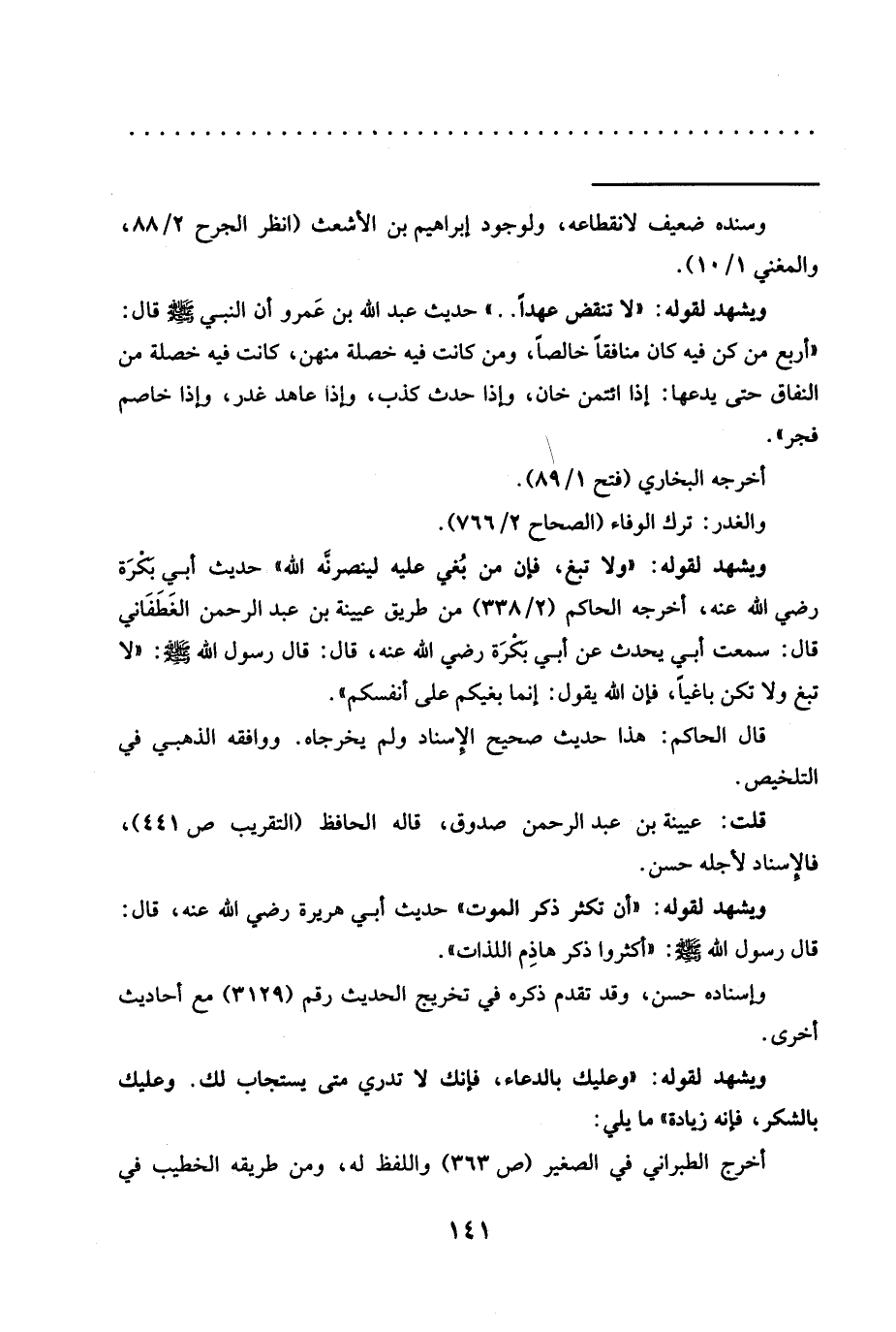 ويشهد لقوله: "لا تنقض عهدًا .. " حديث عَبْدِ اللَّهِ بْنِ عَمرو أَنَّ النَّبِيَّ -صَلَّى الله عليه وسلم- قال: "أربع من كن فيه كان منافقًا خالصًا، ومن كانت فيه خصلة منهن، كانت فيه خصلة من النفاق حتى يدعها: إذا ائتمن خان، وإذا حدث كذب، وإذا عاهد غدر، وإذا خاصم فجر".