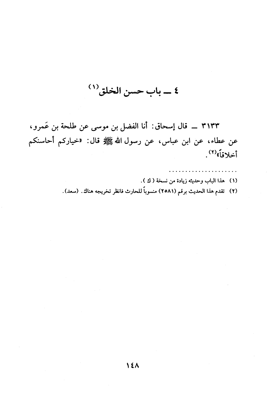 3133 - قَالَ إِسْحَاقُ: أنا الْفَضْلُ بْنُ مُوسَى عَنْ طَلْحَةَ بْنِ عَمْرٍو، عَنْ عَطَاءٍ، عَنِ ابْنِ عَبَّاسٍ، عَنْ رسول الله صَلَّى اللَّهُ عَلَيْهِ وَسَلَّمَ قال: " §خِيَارُكُمْ أَحَاسِنُكُمْ أَخْلَاقًا ".