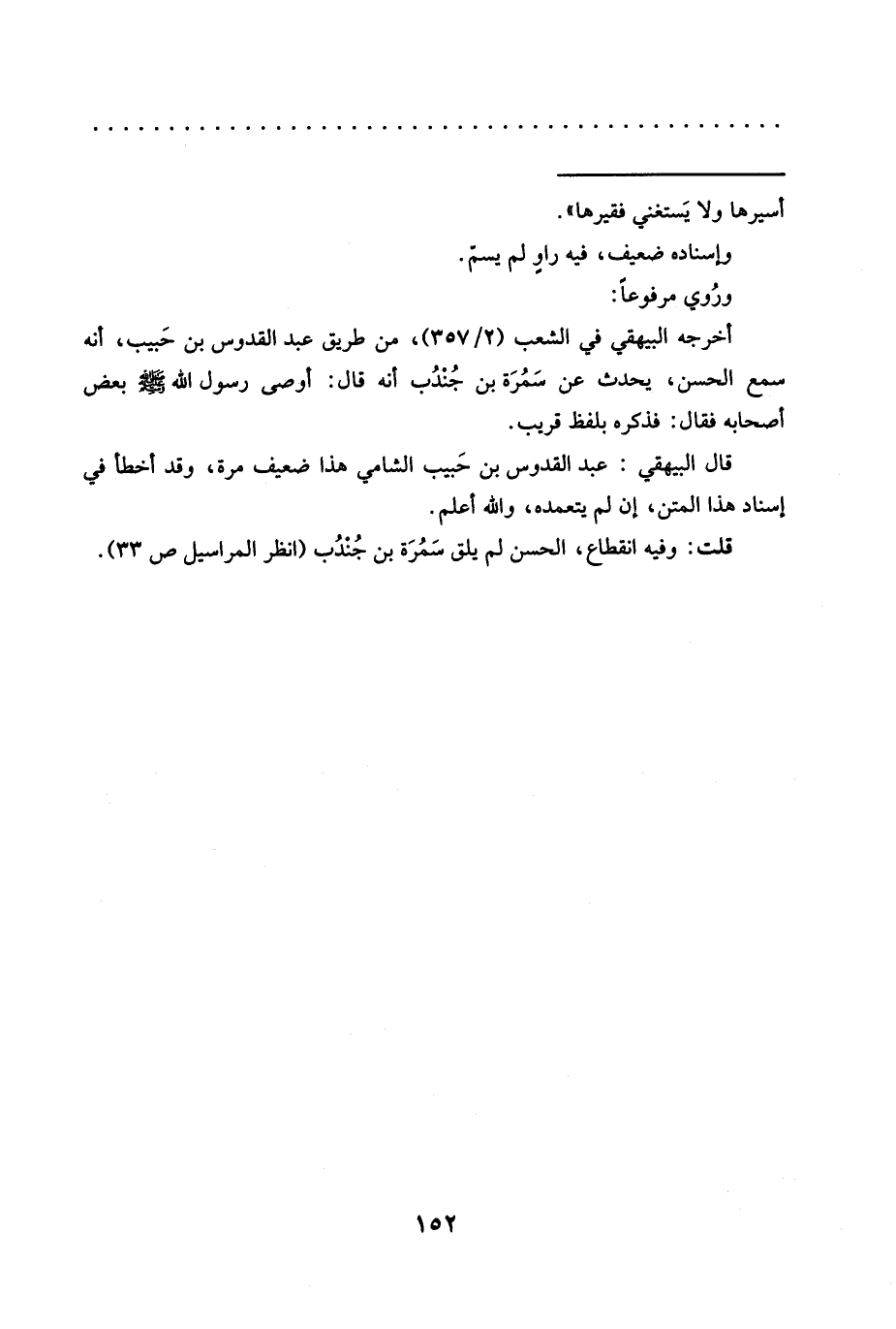 أخرجه البيهقي في الشعب (2/ 357)، من طريق عبد القدوس بن حَبيب، أنه سمع الحسن، يحدث عن سَمُرَة بن جُنْدُب أنه قال: أوصى رَسُولِ اللَّهِ -صَلَّى اللَّهُ عَلَيْهِ وَسَلَّمَ-بَعْضُ أصحابه فقال: فذكره بلفظ قريب.