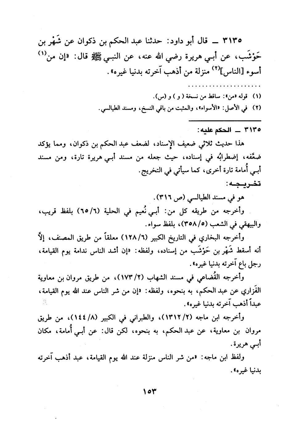 3135 - قَالَ أَبُو دَاوُدَ: حدثنا عَبْدُ الْحَكَمِ بْنُ ذَكْوَانَ عَنْ شَهْرِ بْنِ حَوْشَبٍ، عَنْ أَبِي هُرَيْرَةَ رَضِيَ الله عَنْه، عَنِ النَّبِيِّ صَلَّى اللَّهُ عَلَيْهِ وَسَلَّمَ قَالَ: " §إن من أسوء [النَّاسِ] مَنْزِلَةً مَنْ أَذْهَبَ آخِرَتَهُ بِدُنْيَا غَيْرِهِ ".