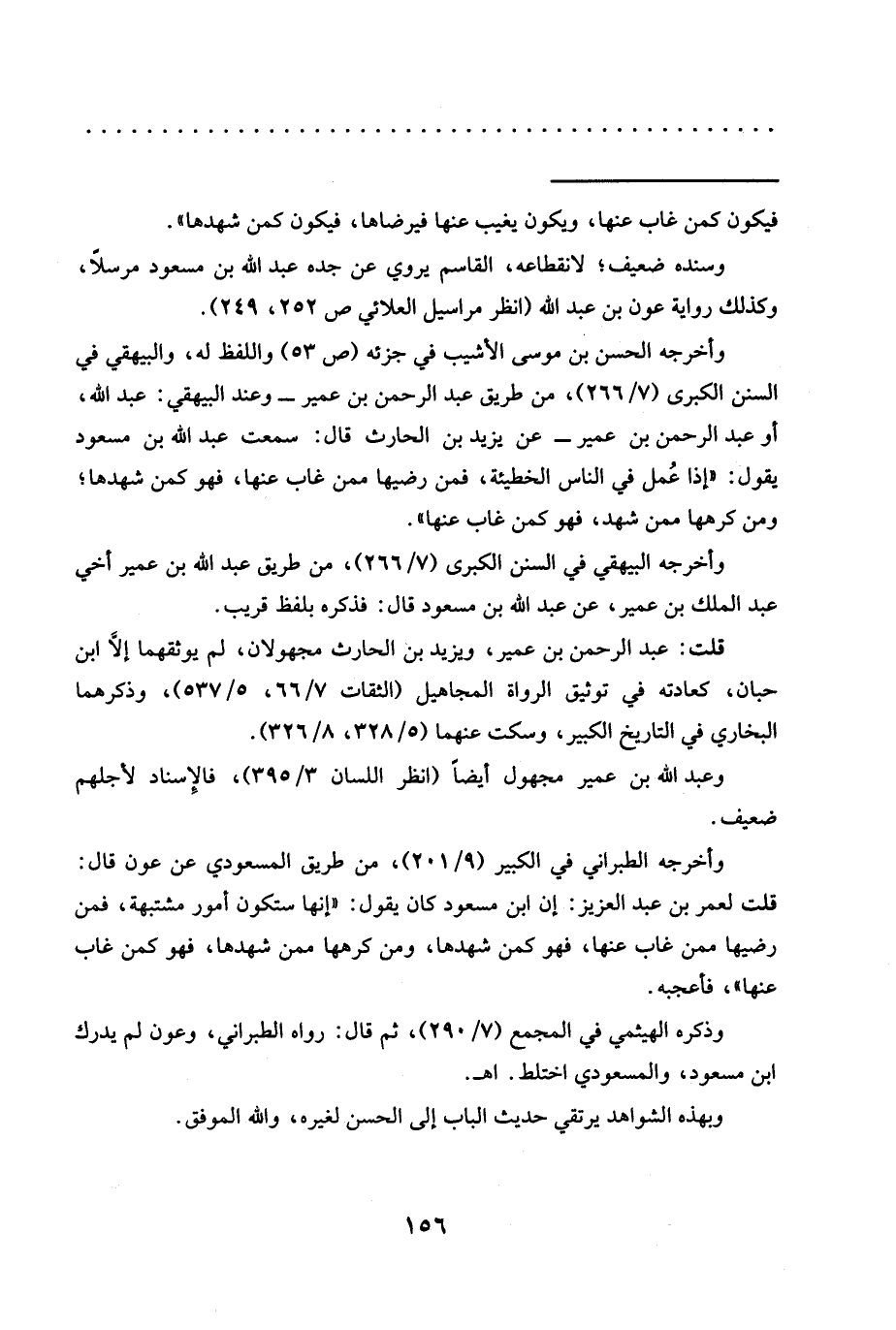 وأخرجه الطبراني في الكبير (9/ 201)، من طريق المسعودي عن عون قال: قلت لعمر بن عبد العزيز: إن ابن مسعود كان يقول: "إنها ستكون أمور مشتبهة، فمن رضيها ممن غاب عنها، فهو كمن شهدها، ومن كرهها ممن شهدها، فهو كمن غاب عنها"، فأعجبه.
