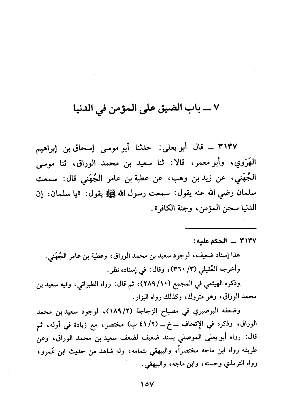 3137 - قَالَ أَبُو يَعْلَى: حدثنا أَبُو مُوسَى إِسْحَاقُ بْنُ إِبْرَاهِيمَ الْهَرَوِيُّ، وَأَبُو مَعْمَرٍ، قَالَا: ثنا سَعِيدُ بْنُ مُحَمَّدٍ الْوَرَّاقُ، ثنا مُوسَى الْجُهَنِيُّ، عَنْ زَيْدِ بْنِ وهب، عن عطية بْنِ عَامِرٍ الْجُهَنِيِّ قَالَ: سمعت سلمان رَضِيَ الله عَنْه يقول: سَمِعْتُ رَسُولَ اللَّهِ صَلَّى اللَّهُ عَلَيْهِ وَسَلَّمَ يَقُولُ: " يَا سَلْمَانُ، إِنَّ §الدُّنْيَا سِجْنُ الْمُؤْمِنِ، وَجَنَّةُ الْكَافِرِ ".