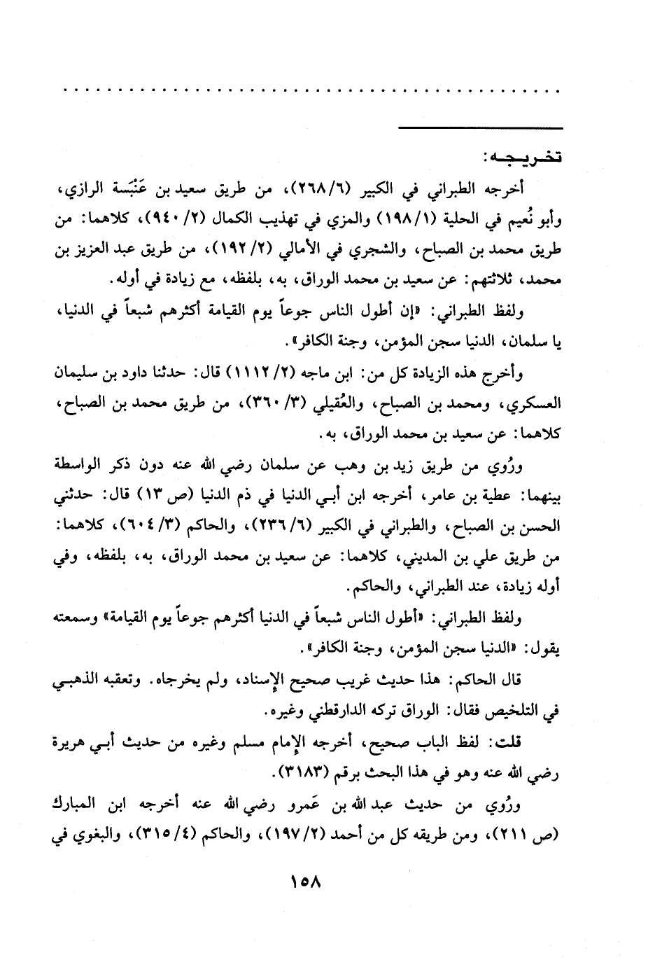 ولفظ الطبراني: "أطول الناس شبعًا في الدنيا أكثرهم جوعا يوم القيامة" وسمعته يقول: "الدنيا سجن المؤمن، وجنة الكافر".