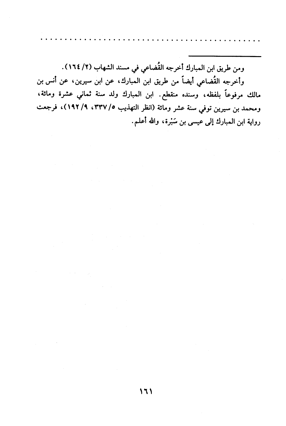 وأخرجه القُضاعي أيضًا من طريق ابن المبارك، عن ابن سيرين، عن أنس بن مالك مرفوعًا بلفظه، وسنده منقطع. ابن المبارك ولد سنة ثماني عشرة ومائة، ومحمد بن سيرين توفي سنة عشر ومائة (انظر التهذيب 5/ 337، 9/ 192)، فرجعت رواية ابن المبارك إلى عيسى بن سَبْرة، والله أعلم.