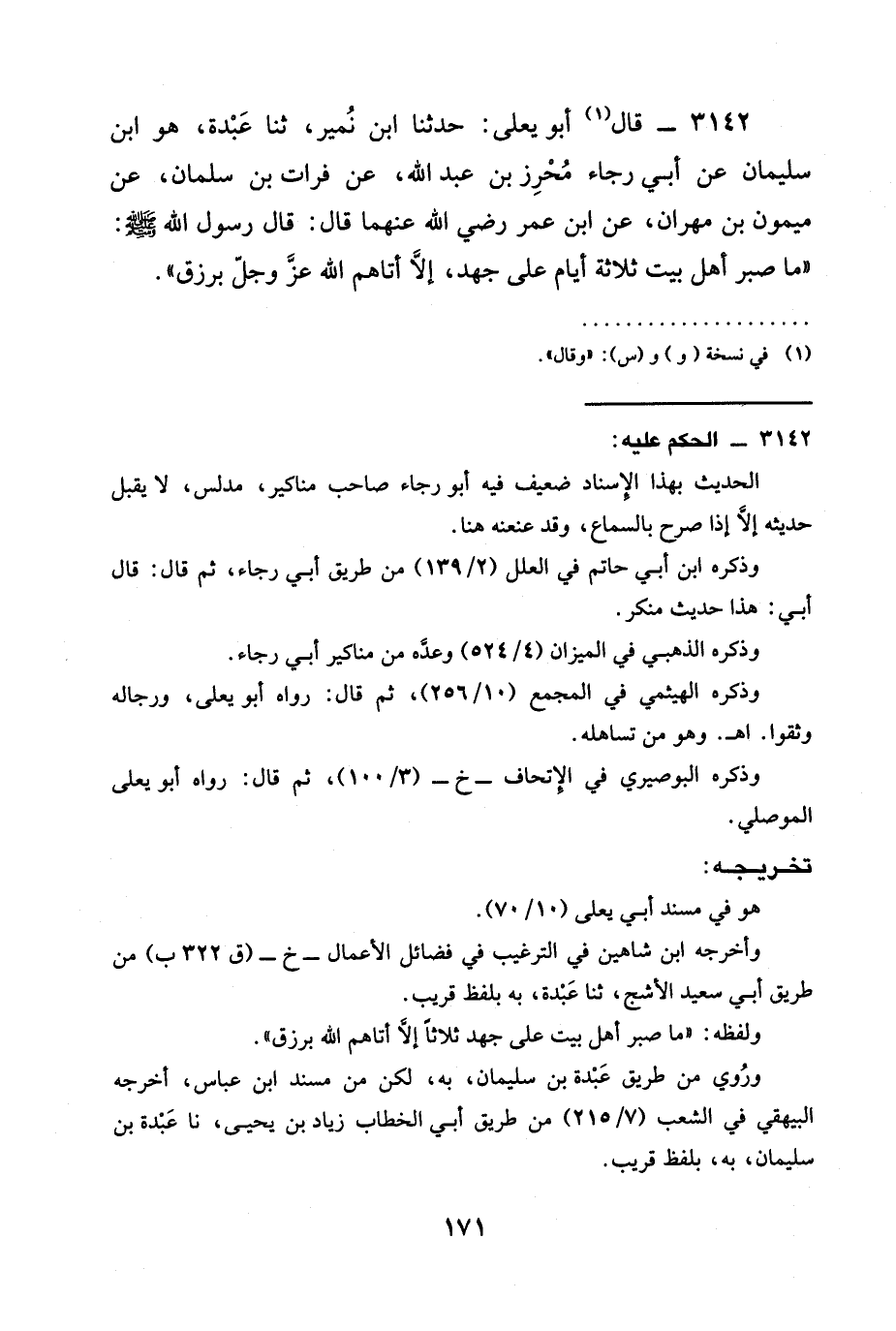 3142 - قال أَبُو يَعْلَى: حدثنا ابْنُ نُمَيْرٍ، ثنا عَبْدَةُ، هُوَ ابْنُ سُلَيْمَانَ عَنْ أَبِي رَجَاءٍ مُحْرِزِ بْنِ عَبْدِ اللَّهِ، عَنْ فُرَاتِ بْنِ سَلْمَانَ، عَنْ مَيْمُونِ بْنِ مِهْرَانَ، عَنِ ابْنِ عمر رَضِيَ الله عَنْهما قَالَ: قَالَ رَسُولُ اللَّهِ صَلَّى اللَّهُ عَلَيْهِ وَسَلَّمَ: " §مَا صَبَرَ أَهْلُ بَيْتٍ ثَلَاثَةَ أَيَّامٍ عَلَى جَهْدٍ، إِلَّا أتاهم الله عزَّ وجلّ بِرِزْقٍ ".