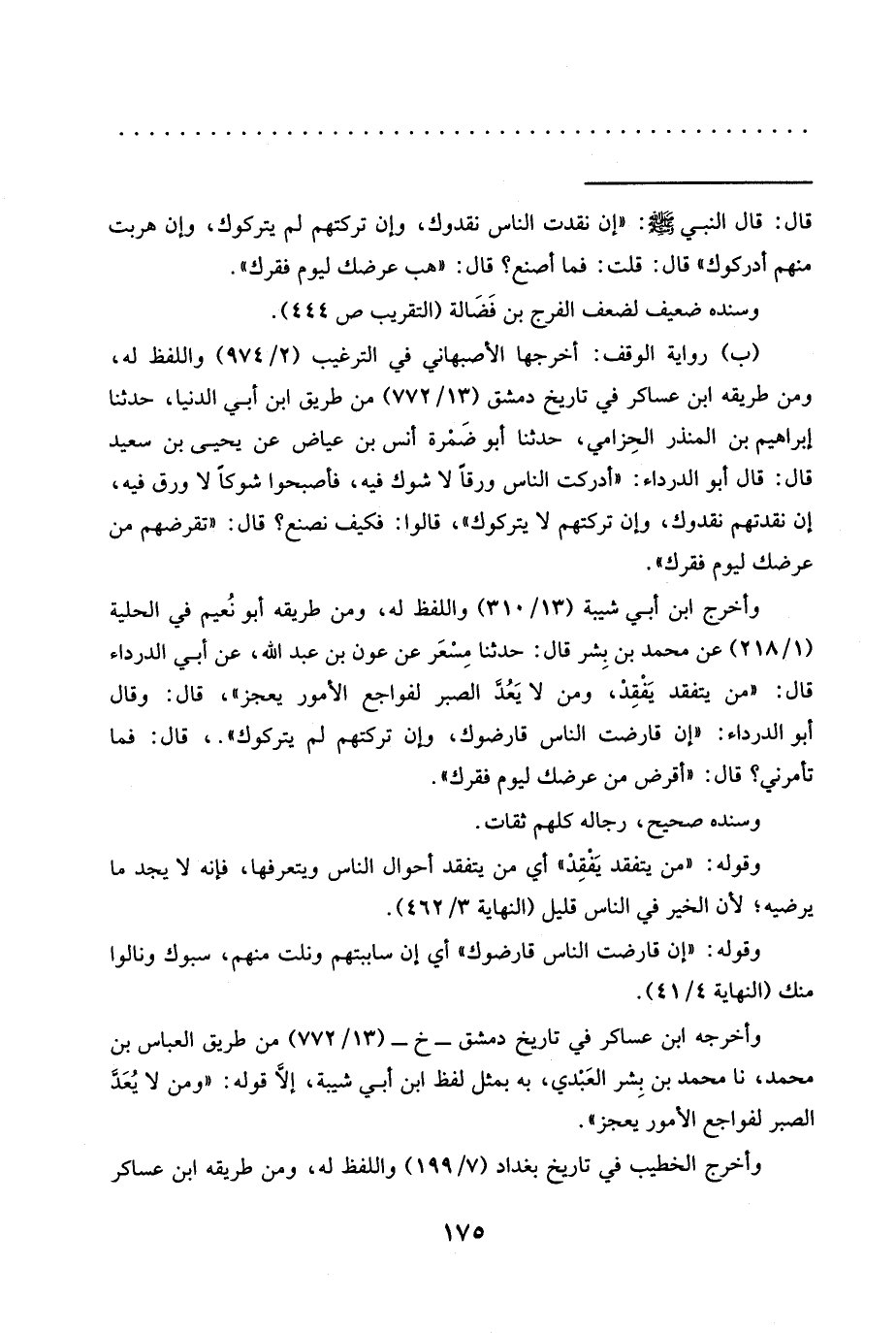 (ب) رواية الوقف: أخرجها الأصبهاني في الترغيب (2/ 974) واللفظ له، ومن طريقه ابن عساكر في تاريخ دمشق (13/ 772) من طريق ابن أبي الدنيا، حدّثنا إبراهيم بن المنذر الحِزامي، حدّثنا أبو ضَمْرة أنس بن عياض عن يحيى بن سعيد قال: قال أبو الدرداء: "أدركت الناس ورقًا لا شوك فيه، فأصبحوا شوكًا لا ورق فيه، إن نقدتهم نقدوك، وإن تركتهم لا يتركوك"، قالوا: فكيف نصنع؟ قال: "تقرضهم من عرضك ليوم فقرك".