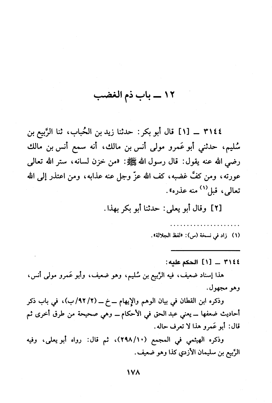 3144 -[1] قَالَ أَبُو بَكْرٍ: حدثنا زَيْدُ بْنُ الْحُبَابِ، ثنا الرَّبِيعُ بْنُ سُليم، حدثني أبو عَمْرٍو مَوْلَى أَنَسِ بْنِ مَالِكٍ، أَنَّهُ سَمِعَ أَنَسَ بْنَ مَالِكٍ رَضِيَ الله عَنْه يَقُولُ: قَالَ رَسُولُ اللَّهِ صَلَّى اللَّهُ عَلَيْهِ وَسَلَّمَ: " §مَنْ خَزَنَ لِسَانَهُ، ستر الله تعالى عَوْرَتَهُ، وَمَنْ كَفَّ غَضَبَهُ، كف الله عزّ وجل عَنْهُ عَذَابَهُ، وَمَنِ اعْتَذَرَ إلى الله تعالى، قَبِلَ مِنْهُ عُذْرَهُ ".