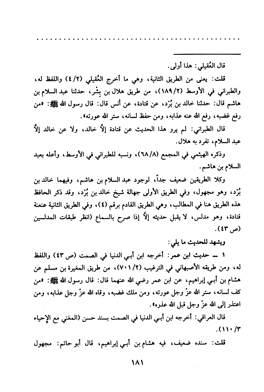 قلت: يعني من الطريق الثانية، وهي ما أخرج العُقيلي (2/ 4) واللفظ له، والطبراني في الأوسط (2/ 189)، من طريق هلال بن بِشْر، حدّثنا عبد السلام بن هاشم قال: حدّثنا خالد بن بُرْد، عَنْ قَتَادَةَ، عَنْ أَنَسٍ قَالَ: قَالَ رَسُولُ اللَّهِ -صَلَّى الله عليه وسلم-: "من رفع غضبه، رفع الله عنه عذابه، ومن حفظ لسانه، ستر الله عورته".