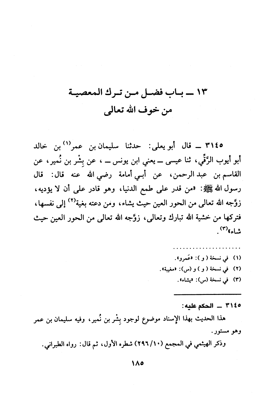 3145 - قَالَ أَبُو يَعْلَى: حدثنا سُلَيْمَانُ بْنُ عُمَرَ بْنِ خَالِدٍ أَبُو أَيُّوبَ الرَّقِّيُّ، ثنا عِيسَى - يَعْنِي ابْنَ يُونُسَ -، عَنْ بِشْرِ بْنِ نُمَيْرٍ، عَنِ الْقَاسِمِ بْنِ عَبْدِ الرَّحْمَنِ، عَنْ أَبِي أُمَامَةَ رَضِيَ الله عَنْه قَالَ: قَالَ رَسُولُ اللَّهِ صَلَّى اللَّهُ عَلَيْهِ وَسَلَّمَ: " §مَنْ قَدَرَ عَلَى طَمَعِ الدُّنْيَا، وَهُوَ قَادِرٌ عَلَى أَنْ لَا يُؤَدِّيَهُ، زوَّجه الله تعالى من الحور الْعِينِ حَيْثُ يَشَاءُ، ومن دعته بغية إِلَى نَفْسِهَا، فَتَرَكَهَا مِنْ خَشْيَةِ اللَّهِ تبارك وتعالى، زوَّجه الله تعالى من الحور العين حيث شاء ".