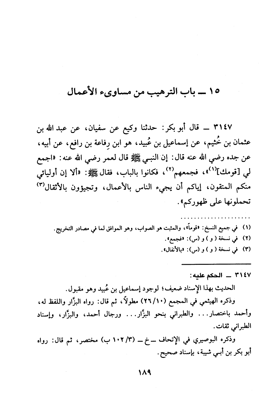 3147 - قَالَ أَبُو بَكْرٍ: حدثنا وَكِيعٌ عَنْ سُفْيَانَ، عَنْ عَبْدِ اللَّهِ بْنِ عُثْمَانَ بْنِ خُثَيْمٍ، عَنْ إِسْمَاعِيلَ بْنِ عُبَيْدٍ، هُوَ ابْنُ رِفَاعَةَ بْنِ رَافِعٍ، عَنْ أَبِيهِ، عَنْ جَدِّهِ رَضِيَ الله عَنْه قال: إن النَّبِيِّ صَلَّى اللَّهُ عَلَيْهِ وَسَلَّمَ قَالَ لِعُمَرَ رَضِيَ الله عَنْه: " اجْمَعْ لِي [قومك] "، فَجَمَعَهُمْ، فكانوا بِالْبَابِ، فَقَالَ صَلَّى اللَّهُ عَلَيْهِ وَسَلَّمَ: " §أَلَا إِنَّ أَوْلِيَائِي مِنْكُمُ الْمُتَّقُونَ، َإِيَّاكُمْ أَنْ يَجِيءَ النَّاسُ بِالْأَعْمَالِ، وتجيؤون بِالْأَثْقَالِ تَحْمِلُونَهَا عَلَى ظُهُورِكُمْ ".