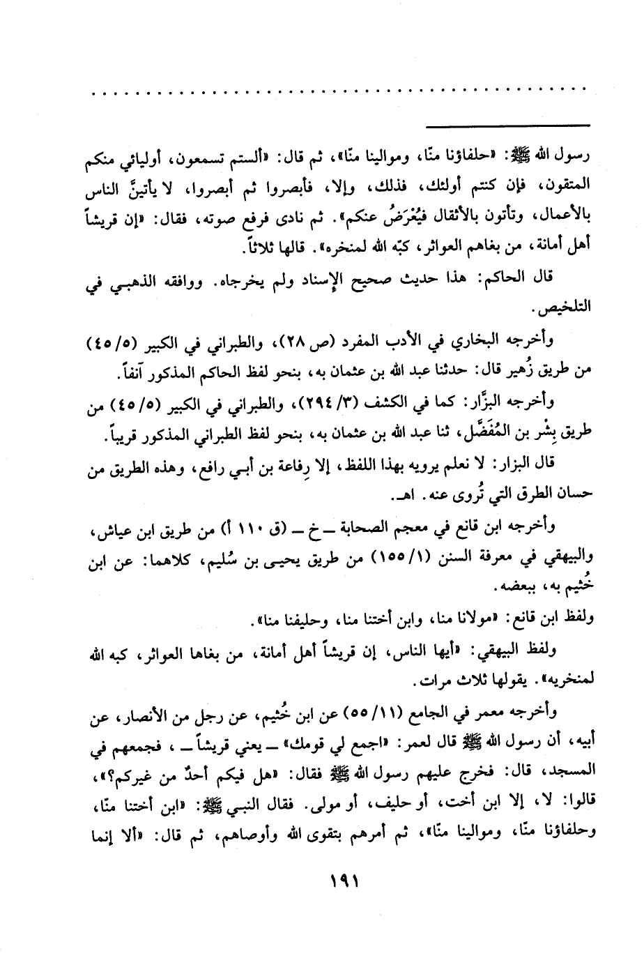 = رَسُولَ اللَّهِ -صَلَّى اللَّهُ عَلَيْهِ وَسَلَّمَ-: "حلفاؤنا منا، وموالينا منّا"، ثم قال: "ألستم تسمعون، أوليائي منكم المتقون، فإن كنتم أولئك، فذلك، وإلا، فأبصروا ثم أبصروا، لا يأتين الناس بالأعمال، وتأتون بالأثقال فيُعْرَضُ عنكم". ثم نادى فرفع صوته، فقال: "إن قريشًا أهل أمانة، من بغاهم العواثر، كبّه الله لمنخره". قالها ثلاثًا.