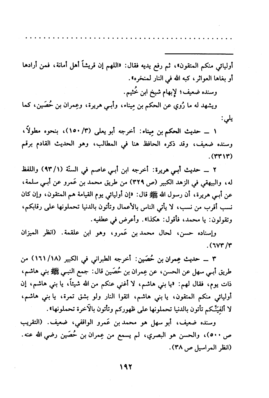 3 - حديث عِمران بن حُصَين: أخرجه الطبراني في الكبير (18/ 161) من طريق أبي سهل عَنِ الْحَسَنِ، عَنْ عِمران بْنِ حُصَين قَالَ: جمع النبي -صلى الله عليه وسلم- بني هاشم، ذات يوم، فقال لهم: "يا بني هاشم، لا أغني عنكم من الله شيئًا، يا بني هاشم، إن أوليائي منكم المتقون، يا بني هاشم، اتقوا النار ولو بشق تمرة، يا بني هاشم، لا ألفِيِّنكم تأتون بالدنيا تحملونها على ظهوركم وتأتون بالآخرة تحملونها".