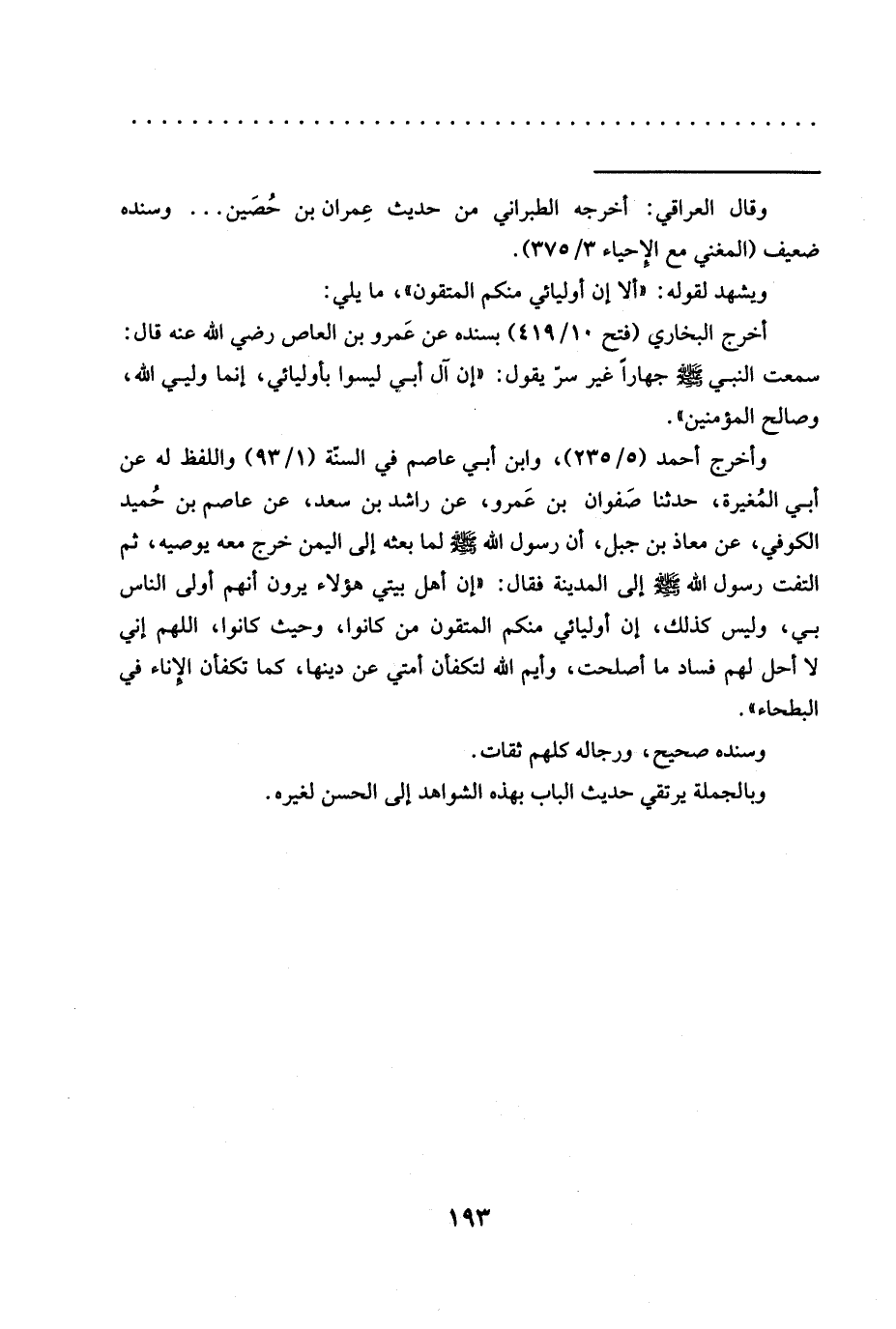أخرج البخاريُّ (فتح 10/ 419) بسنده عَنْ عَمرو بْنِ الْعَاصِ رَضِيَ اللَّهُ عَنْهُ قَالَ: سَمِعْتُ النَّبِيَّ -صَلَّى اللَّهُ عَلَيْهِ وَسَلَّمَ- جهارًا غير سرّ يقول: "إن آل أبي ليسوا بأوليائي، إنما وليي الله، وصالح المؤمنين".