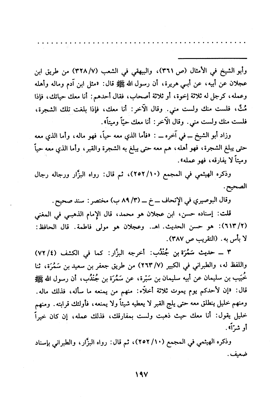 وزاد أبو الشيخ -في آخره-:"فأما الذي معه حيًا، فهو ماله، وأما الذي معه حتى يبلغ الشجرة، فهو أهله، هم معه حتى يبلغ به الشجرة والقبر، وأما الذي معه حيًا وميتا لا يفارقه، فهو عمله".