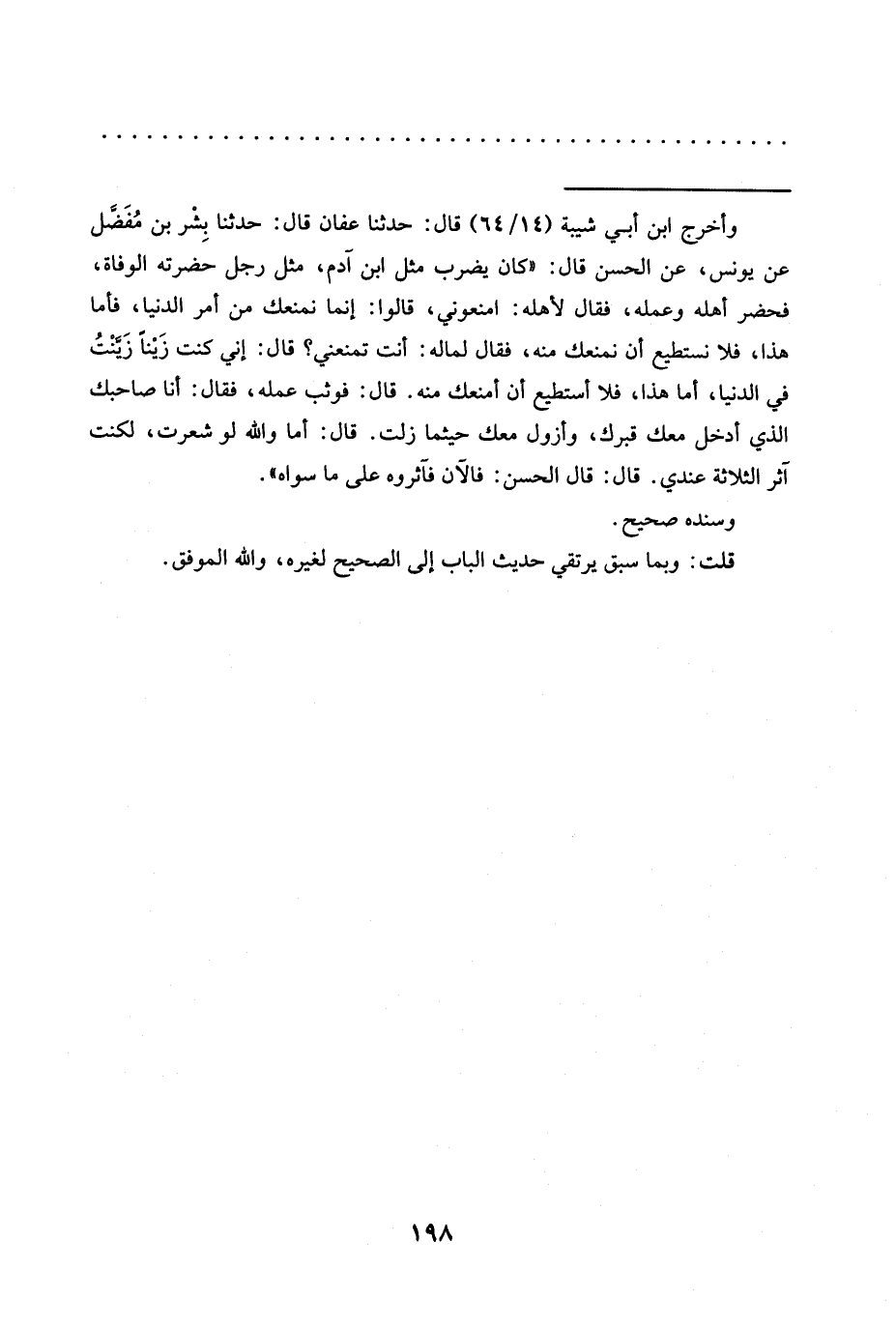 = وأخرج ابن أبي شيبة (14/ 64) قال: حدّثنا عفان قال: حدّثنا بِشْر بن مُفَضَّل عن يونس، عن الحسن قال: "كان يضرب مثل ابن آدم، مثل رجل حضرته الوفاة، فحضر أهله وعمله، فقال لأهله: امنعوني، قالوا: إنما نمنعك من أمر الدنيا، فأما هذا، فلا نستطيع أن نمنعك منه، فقال لماله: أنت تمنعني؟ قال: إني كنت زَيْنًا زيَّنْتُ في الدنيا، أما هذا، فلا أستطيع أن أمنعك منه. قال: فوثب عمله، فقال: أنا صاحبك الذي أدخل معك قبرك، وأزول معك حيثما زلت. قال: أما والله لو شعرت، لكنت آثر الثلاثة عندي. قال: قال الحسن: فالآن فآثروه على ما سواه".