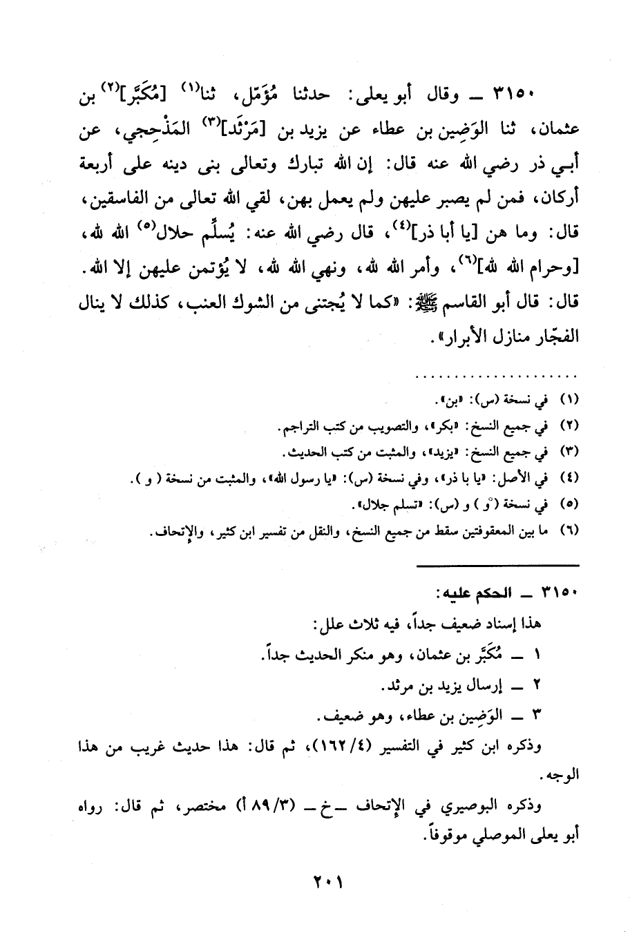 3150 - وقال أَبُو يعلى: حدثنا مُؤَمّل، ثنا [مُكَبَّر] بْنُ عُثْمَانَ، ثنا الْوَضِينُ بْنُ عَطَاءٍ عَنْ يزيد بن [مَرْثَد] الْمَذْحِجِيِّ، عَنْ أَبِي ذَرٍّ رَضِيَ الله عَنْه قَالَ: إن الله تبارك وتعالى بَنَى دِينَهُ عَلَى أَرْبَعَةِ أَرْكَانٍ، فَمَنْ لَمْ يَصْبِرْ عَلَيْهِنَّ وَلَمْ يَعْمَلْ بِهِنَّ، لقي الله تعالى مِنَ الفاسقين، قال: وَمَا هُنَّ [يَا أَبَا ذر] ، قال رَضِيَ الله عَنْه: يُسلِّم حَلَالَ اللَّهِ لِلَّهِ، [وَحَرَامَ اللَّهِ لِلَّهِ] ، وَأَمْرَ اللَّهِ لِلَّهِ، وَنَهْيَ اللَّهِ لِلَّهِ، لا يُؤْتَمَنُ عَلَيْهِنَّ إِلَّا اللَّهُ. قَالَ: قال أبو القاسم صَلَّى اللَّهُ عَلَيْهِ وَسَلَّمَ: " كما §لَا يُجْتَنَى مِنَ الشَّوْكِ الْعِنَبُ، كَذَلِكَ لَا يَنَالُ الْفُجَّارُ مَنَازِلَ الْأَبْرَارِ ".