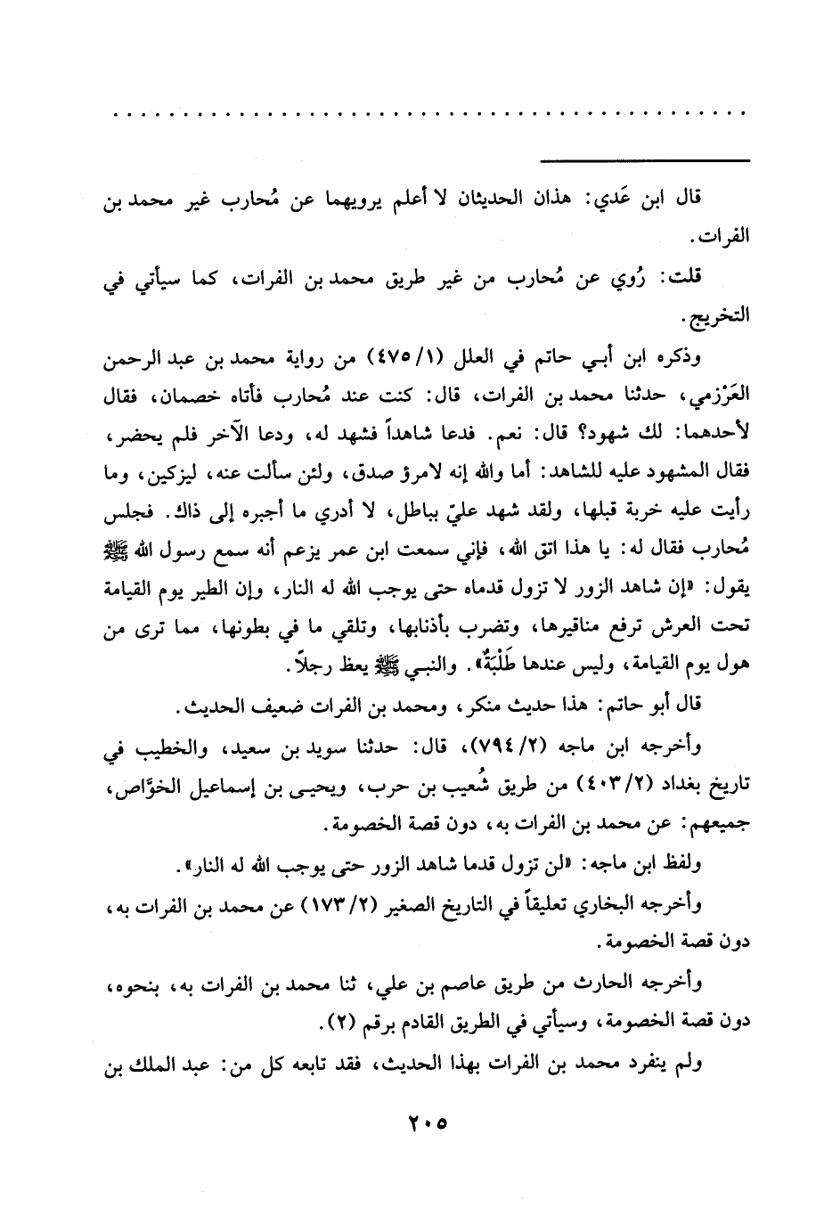 قلت: رُوي عن مُحارب من غير طريق محمد بن الفرات، كما سيأتي في التخريج. وذكره ابن أبي حاتم في العلل (1/ 475) من رواية محمَّد بن عبد الرحمن العَرْزمي، حدّثنا محمَّد بن الفرات، قال: كنت عند مُحارب فأتاه خصمان، فقال لأحدهما: لك شهود؟ قال: نعم. فدعا شاهدا فشهد له، ودعا الآخر فلم يحضر، فقال المشهود عليه للشاهد: أما والله إنه لامرؤ صدق، ولئن سألت عنه، ليزكين، وما رأيت عليه خربة قبلها، ولقد شهد علىّ بباطل، لا أدري ما أجبره إلى ذاك. فجلس مُحارب فقال له: يا هذا اتق الله، فإني سمعت ابن عمر يزعم أَنَّهُ سَمِعَ رَسُولَ اللَّهِ -صَلَّى اللَّهُ عَلَيْهِ وسلم- يقول: "إن شاهد الزور لا تزول قدماه حتى يوجب الله له النار، وإن الطير يوم القيامة تحت العرش ترفع مناقيرها، وتضرب بأذنابها، وتلقي ما في بطونها، مما ترى من هول يوم القيامة، وليس عندها طَلْبَةٌ". والنبي -صلى الله عليه وسلم- يعظ رجلًا.