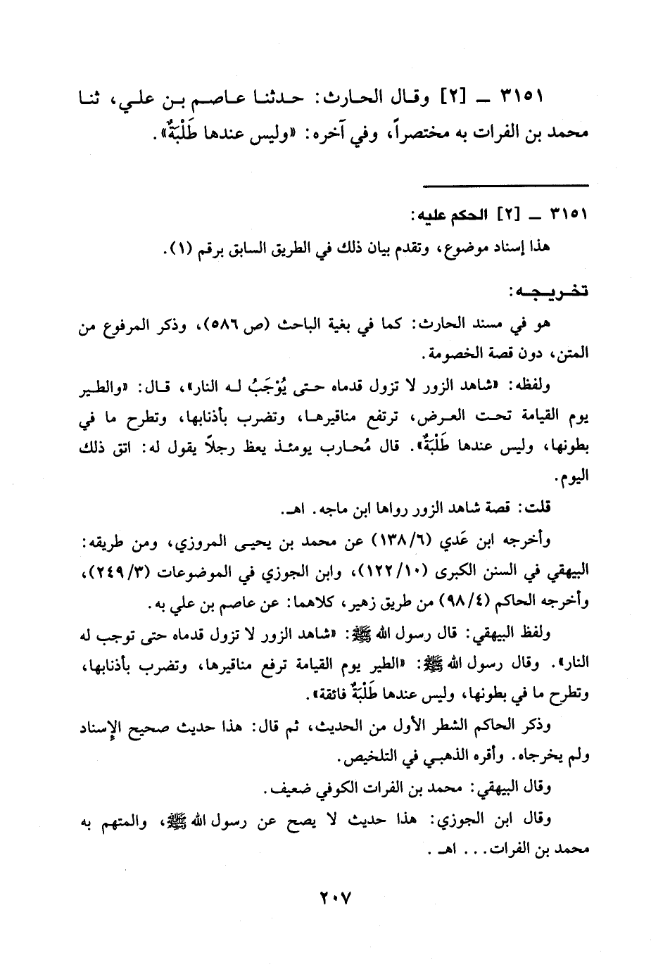 3151 - [2] وَقَالَ الْحَارِثُ: حَدَّثَنَا عَاصِمُ بْنُ عَلِيٍّ، ثنا محمَّد بْنُ الْفُرَاتِ بِهِ مُخْتَصَرًا، وَفِي آخِرِهِ: "وليس عندها طَلْبةٌ".
