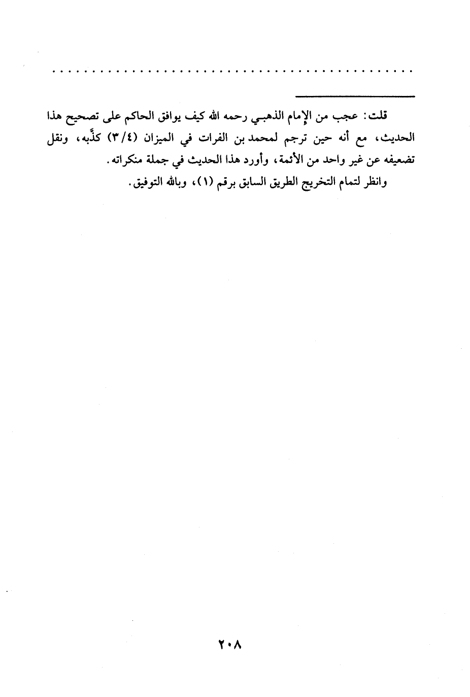 = قلت: عجب من الإمام الذهبي رحمه الله كيف يوافق الحاكم على تصحيح هذا الحديث، مع أنه حين ترجم لمحمد بن الفرات في الميزان (3/ 4) كذَّبه، ونقل تضعيفه عن غير واحد من الأئمة، وأورد هذا الحديث في جملة منكراته.