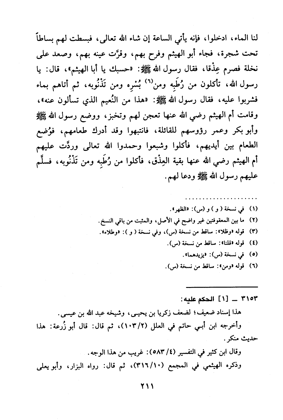 لَنَا الْمَاءَ، ادْخُلُوا، فَإِنَّهُ يَأْتِي السَّاعَةَ إِنْ شاء الله تعالى، فبسطت لهم بِسَاطًا تَحْتَ شَجَرَةٍ، فَجَاءَ أَبُو الْهَيْثَمِ وَفَرِحَ بِهِمْ، وقرَّت عَيْنُهُ بِهِمْ، وَصَعِدَ عَلَى نَخْلَةٍ فصرم عِذْقا، فَقَالَ رَسُولُ اللَّهِ -صَلَّى اللَّهُ عَلَيْهِ وَسَلَّمَ-: "حَسْبُكَ يَا أَبَا الْهَيْثَمِ"، قَالَ: يَا رَسُولَ اللَّهِ -صَلَّى اللَّهُ عَلَيْهِ وَسَلَّمَ-، تَأْكُلُونَ مِنْ رُطَبِه ومن (¬1) بُسْرِه وَمِنْ تَذْنُوبه، ثُمَّ أَتَاهُمْ بِمَاءٍ فَشَرِبُوا عَلَيْهِ، فَقَالَ رَسُولُ اللَّهِ -صَلَّى اللَّهُ عَلَيْهِ وَسَلَّمَ-: "هذا من النعيم الذي تسألون عنه"، وقامت أم الهيثم رضي الله عنها تَعْجِنُ لَهُمُ وَتَخْبِزُ، وَوَضَعَ رَسُولُ اللَّهِ -صَلَّى اللَّهُ عَلَيْهِ وَسَلَّمَ- وَأَبُو بكر وعمر رؤوسهم للقائلة، فانتبهوا وقد أدرك طعامهم، فوُضع الطعام بين أيديهم، فأكلوا وشبعوا وحمدوا الله تعالى وردَّت عليهم أم الهيثم رضي الله عنها بَقِيَّةَ العِذْق، فَأَكَلُوا مِنْ رُطَبِه وَمِنْ تَذْنُوبه، فسلَّم عَلَيْهِمْ رَسُولُ اللَّهِ -صَلَّى اللَّهُ عَلَيْهِ وَسَلَّمَ- ودعا لهم.