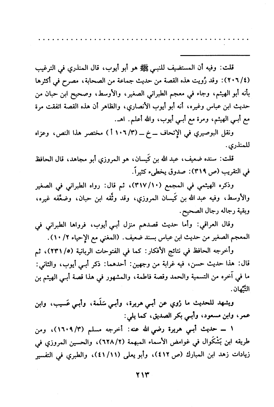 = قلت: وفيه أن المستضيف للنبي-صلى الله عليه وسلم- هو أبو أيوب، قال المنذري في الترغيب (4/ 206): وقد رُويت هذه القصة من حديث جماعة من الصحابة، مصرح في أكثرها بأنه أبو الهيثم، وجاء في معجم الطبراني الصغير، والأوسط، وصحيح ابن حبّان من حديث ابن عباس وغيره، أنه أبو أيوب الأنصاري، والظاهر أن هذه القصة اتفقت مرة مع أبي الهيثم، ومرة مع أبي أيوب، والله أعلم. أهـ.