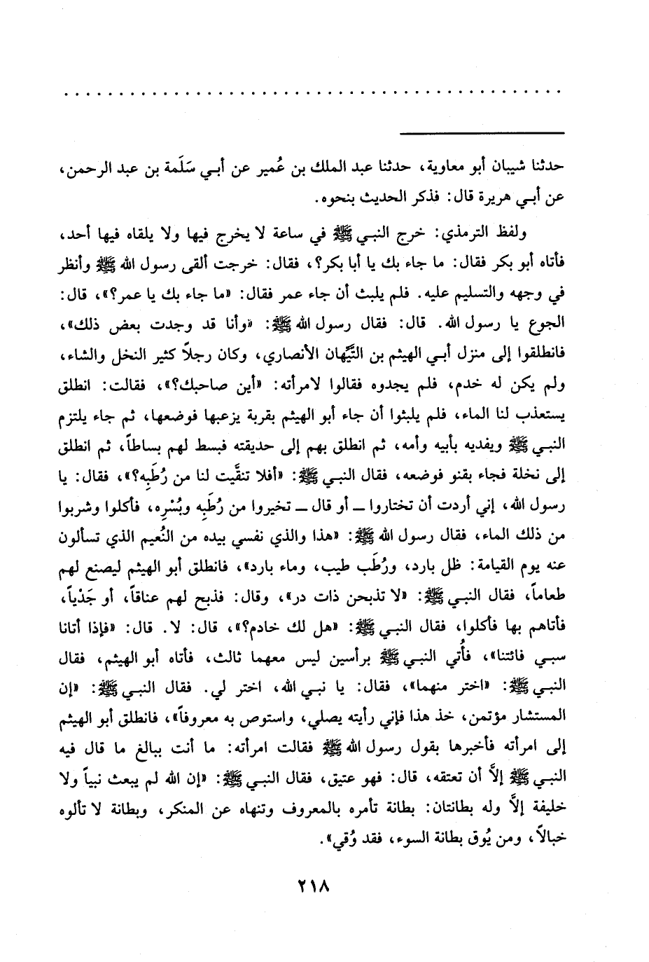 ولفظ الترمذي: خرج النبي -صلى الله عليه وسلم- في ساعة لا يخرج فيها ولا يلقاه فيها أحد، فأتاه أبو بكر فقال: ما جاء بك يا أبا بكر؟، فقال: خرجت أَلْقَى رَسُولَ اللَّهِ -صَلَّى اللَّهُ عَلَيْهِ وَسَلَّمَ- وأنظر في وجهه والتسليم عليه. فلم يلبث أن جاء عمر فقال: "ما جاء بك يا عمر؟ "، قال: الجوع يا رسول الله. قَالَ: فَقَالَ رَسُولُ اللَّهِ -صَلَّى اللَّهُ عَلَيْهِ وسلم-: "وأنا قد وجدت بعض ذلك"، فانطلقوا إِلَى مَنْزِلِ أَبِي الْهَيْثَمِ بْنِ التَّيِّهان الْأَنْصَارِيِّ، وكان رجلًا كثير النخل والشاء، ولم يكن له خدم، فلم يجدوه فقالوا لامرأته: "أين صاحبك؟ "، فقالت: انطلق يستعذب لنا الماء، فلم يلبثوا أن جاء أبو الهيثم بقربة يزعبها فوضعها، ثم جاء يلتزم النبي -صلى الله عليه وسلم- ويفديه بأبيه وأمه، ثم انطلق بهم إلى حديقته فبسط لهم بساطًا، ثم انطلق إلى نخلة فجاء بقنو فوضعه، فقال النبي -صلى الله عليه وسلم-: "أفلا تنقّيت لنا من رُطَبه؟ "، فقال: يا رسول الله، إني أردت أن تختاروا -أو قال- تخيروا من رُطَبِه وبُسْرِه، فأكلوا وشربوا من ذلك الْمَاءُ، فَقَالَ رَسُولُ اللَّهِ -صَلَّى اللَّهُ عَلَيْهِ وَسَلَّمَ-: "هذا والذي نفسي بيده من النعيم الذي تسألون عنه يوم القيامة: ظل بارد، ورُطَب طيب، وماء بارد"، فانطلق أبو الهيثم ليصنع لهم طعامًا، فَقَالَ النَّبِيُّ -صَلَّى اللَّهُ عَلَيْهِ وَسَلَّمَ-: "لَا تذبحن ذات در"، وقال: فذبح لهم عناقًا، أو جَدْيًا، فأتاهم بها فأكلوا، فقال النبي -صلى الله عليه وسلم-: "هل لك خادم؟ "، قال: لا. قال: "فإذا أتانا سبي فائتنا"، فأتي النبي -صلى الله عليه وسلم- برأسين ليس معهما ثالث، فأتاه أبو الهيثم، فقال النبي -صلى الله عليه وسلم-: "اختر منهما"، فقال: يا نبي الله، اختر لي. فقال النبي -صلى الله عليه وسلم-: "إن المستشار مؤتمن، خذ هذا فإني رأيته يصلي، واستوص به معروفًا"، فانطلق أبو الهيثم إلى امرأته فأخبرها بقول رسول الله -صلى الله عليه وسلم- فقالت امرأته: ما أنت ببالغ ما قال فيه النبي -صلى الله عليه وسلم- إلّا أن تعتقه، قال: فهو عتيق، فقال النبي -صَلَّى اللَّهُ عَلَيْهِ وَسَلَّمَ-: "إِنَّ اللَّهَ لَمْ يبعث نبيًا ولا خليفة إلّا وله بطانتان: بطانة تأمره بالمعروف وتنهاه عن المنكر، وبطانة لا تألوه خبالًا، ومن يُوق بطانة السوء، فقد وُقي". =