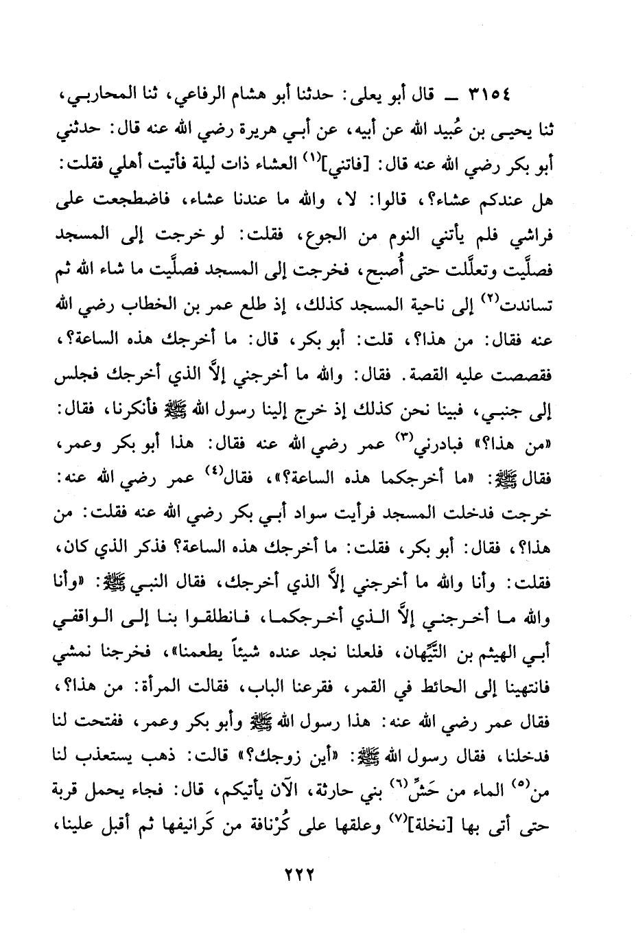 3154 - قَالَ أَبُو يَعْلَى: حدثنا أَبُو هِشَامٍ الرِّفَاعِيُّ، ثنا الْمُحَارِبِيُّ، ثنا يَحْيَى بْنُ عُبَيْدِ اللَّهِ عَنْ أَبِيهِ، عَنْ أَبِي هريرة رَضِيَ الله عَنْه قال: حَدَّثَنِي أَبُو بَكْرٍ رَضِيَ الله عَنْه قَالَ: [فَاتَنِي] الْعِشَاءُ ذَاتَ لَيْلَةٍ فَأَتَيْتُ أَهْلِي فَقُلْتُ: هَلْ عِنْدَكُمْ عَشَاءٌ؟ ، قَالُوا: لَا، وَاللَّهِ مَا عِنْدَنَا عَشَاءٌ، فَاضْطَجَعْتُ عَلَى فِرَاشِي، فَلَمْ يَأْتِنِي النَّوْمُ مِنَ الْجُوعِ، فَقُلْتُ: لَوْ خَرَجْتُ إِلَى الْمَسْجِدِ فصلَّيت وتعلَّلت حَتَّى أُصْبِحَ، فَخَرَجْتُ إِلَى الْمَسْجِدِ فَصَلَّيْتُ مَا شَاءَ اللَّهُ ثُمَّ تَسَانَدْتُ إِلَى نَاحِيَةِ الْمَسْجِدِ كَذَلِكَ، إِذْ طَلَعَ عُمَرُ بْنُ الخطاب رَضِيَ الله عَنْه فقال: من هذا؟ ، قلت: أبو بكر، قال: مَا أَخْرَجَكَ هَذِهِ السَّاعَةَ؟ ، فَقَصَصْتُ عَلَيْهِ الْقِصَّةَ. فَقَالَ: وَاللَّهِ مَا أَخْرَجَنِي إِلَّا الَّذِي أَخْرَجَكَ فَجَلَسَ إِلَى جَنْبِي، فبينا نَحْنُ كَذَلِكَ إِذْ خَرَجَ إِلَيْنَا رَسُولُ اللَّهِ صَلَّى اللَّهُ عَلَيْهِ وَسَلَّمَ فَأَنْكَرَنَا، فَقَالَ: " مَنْ هَذَا؟ " فَبَادَرَنِي عُمَرُ رَضِيَ الله عَنْه فَقَالَ: هَذَا أَبُو بَكْرٍ وَعُمَرُ، فَقَالَ صَلَّى اللَّهُ عَلَيْهِ وَسَلَّمَ: " مَا أَخْرَجَكُمَا هَذِهِ السَّاعَةَ؟ "، فَقَالَ عُمَرُ رَضِيَ الله عَنْه: خَرَجْتُ فَدَخَلْتُ الْمَسْجِدَ فَرَأَيْتُ سَوَادَ أَبِي بَكْرٍ رَضِيَ الله عَنْه فَقُلْتُ: مَنْ هَذَا؟ فَقَالَ: أَبُو بَكْرٍ، فَقُلْتُ: مَا أَخْرَجَكَ هَذِهِ السَّاعَةَ؟ فَذَكَرَ الَّذِي كَانَ، فَقُلْتُ: §وَأَنَا وَاللَّهِ مَا أَخْرَجَنِي إِلَّا الَّذِي أَخْرَجَكَ، فَقَالَ النَّبِيُّ صَلَّى اللَّهُ عَلَيْهِ وَسَلَّمَ: " وَأَنَا وَاللَّهِ مَا أَخْرَجَنِي إِلَّا الَّذِي أَخْرَجَكُمَا، فَانْطَلِقُوا بِنَا إِلَى الْوَاقِفِيِّ أَبِي الْهَيْثَمِ بْنِ التَّيْهَانِ، فَلَعَلَّنَا نَجِدُ عِنْدَهُ شَيْئًا يُطْعِمُنَا "، فَخَرَجْنَا نَمْشِي فَانْتَهَيْنَا إِلَى الْحَائِطِ فِي الْقَمَرِ، فَقَرَعْنَا الْبَابَ، فَقَالَتِ الْمَرْأَةُ: مَنْ هَذَا؟ ، فَقَالَ عُمَرُ رَضِيَ الله عَنْه: هَذَا رَسُولُ اللَّهِ صَلَّى اللَّهُ عَلَيْهِ وَسَلَّمَ وَأَبُو بَكْرٍ وَعُمَرُ، فَفَتَحَتْ لَنَا فَدَخَلْنَا، فَقَالَ رَسُولُ اللَّهِ صَلَّى اللَّهُ عَلَيْهِ وَسَلَّمَ: " أَيْنَ زَوْجُكِ؟ " قَالَتْ: ذَهَبَ يَسْتَعْذِبُ لَنَا مِنَ الْمَاءِ من حَشِّ بن حَارِثَةَ، الْآنَ يَأْتِيكُمْ، قَالَ: فَجَاءَ يَحْمِلُ قِرْبَةً حَتَّى أَتَى بِهَا [نَخْلَةً] وَعَلَّقَهَا عَلَى كِرْنَافَةٍ مِنْ كَرَانِيفِهَا ثُمَّ أَقْبَلَ عَلَيْنَا،