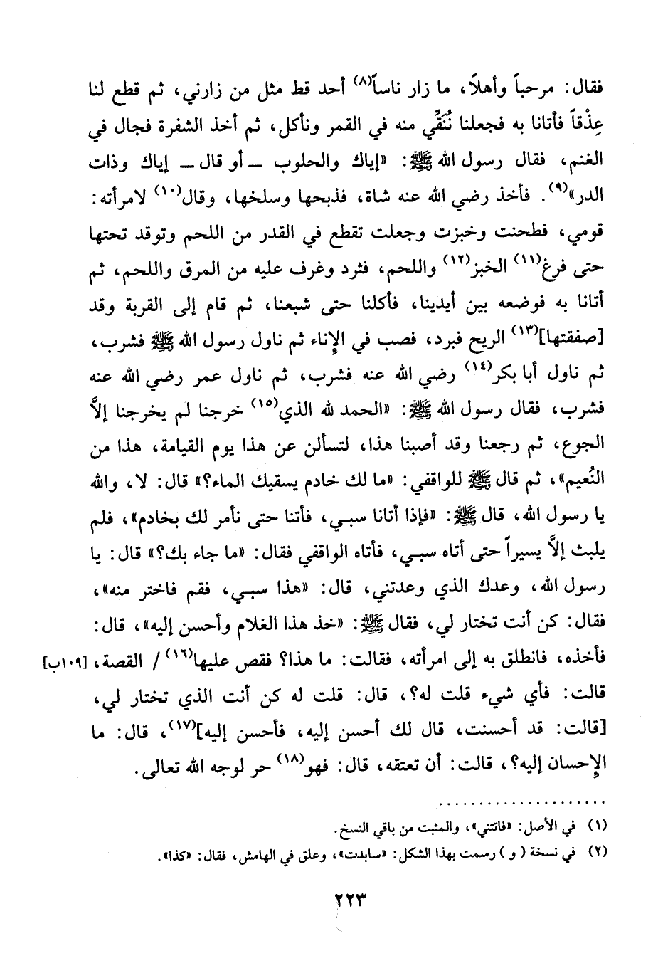 فقال: مرحبًا وأهلًا، ما زار ناسًا (¬1) أَحَدٌ قَطُّ مِثْلُ مَنْ زَارَنِي، ثُمَّ قَطَعَ لنا عِذْقًا فأتانا به فجعلنا نُنَقِّي منه في القمر ونأكل، ثُمَّ أَخَذَ الشَّفْرَةَ فَجَالَ فِي الْغَنَمِ، فَقَالَ رَسُولُ اللَّهِ -صَلَّى اللَّهُ عَلَيْهِ وَسَلَّمَ-: "إِيَّاكَ والحلوب -أو قال- إياك وذات الدر" (¬2). فأخذ رضي الله عنه شاة، فذبحها وسلخها، وقال (¬3) لامرأته: قومي، فطحنت وَخَبَزَتْ وَجَعَلَتْ تَقْطَعُ فِي الْقِدْرِ مِنَ اللَّحْمِ وتوقد تحتها حتى فرغ (¬4) الخبز (¬5) واللحم، فثرد وغرف عليه مِنَ الْمَرَقِ وَاللَّحْمِ، ثُمَّ أَتَانَا بِهِ فَوَضَعَهُ بَيْنَ أَيْدِينَا، فَأَكَلْنَا حَتَّى شَبِعْنَا، ثُمَّ قَامَ إلى القربة وقد [صفقتها] (¬6) الرِّيحُ فَبَرَّدَ، فَصَبَّ فِي الإِناء ثُمَّ نَاوَلَ رَسُولَ اللَّهِ -صَلَّى اللَّهُ عَلَيْهِ وَسَلَّمَ- فَشَرِبَ، ثم ناول أبا بكر (¬7) رضي الله عنه فشرب، ثم ناول عمر رضي الله عنه فَشَرِبَ، فَقَالَ رَسُولُ اللَّهِ -صَلَّى اللَّهُ عَلَيْهِ وَسَلَّمَ-: "الحمد لله الذي (¬8) خَرَجْنَا لَمْ يُخْرِجْنَا إِلَّا الْجُوعُ، ثُمَّ رَجَعْنَا وقد أصبنا هذا، لتسألن عَنْ هَذَا يَوْمَ الْقِيَامَةِ، هَذَا مِنَ النَّعِيمِ"، ثم قال -صلى الله عليه وسلم- لِلْوَاقِفِيِّ: "مَا لَكَ خَادِمٌ يَسْقِيكَ الْمَاءَ؟ " قَالَ: لا، والله يَا رَسُولَ اللَّهِ، قَالَ -صَلَّى اللَّهُ عَلَيْهِ وسلم-: "فَإِذَا أَتَانَا سَبْيٌ، فَأْتِنَا حَتَّى نَأْمُرَ لَكَ بِخَادِمٍ"، فَلَمْ يَلْبَثْ إلَّا يَسِيرًا حَتَّى أَتَاهُ سَبْيٌ، فَأَتَاهُ الْوَاقِفِيُّ فَقَالَ: "مَا جَاءَ بِكَ؟ " قَالَ: يَا رَسُولَ اللَّهِ، وَعْدُكَ الَّذِي وَعَدْتَنِي، قال: "هذا سبي، فقم فاختر منه"، فقال: كن أنت تختار لي، فقال -صلى الله عليه وسلم-: "خُذْ هَذَا الْغُلَامَ وَأَحْسِنْ إِلَيْهِ"، قَالَ: فَأَخَذَهُ، فَانْطَلَقَ بِهِ إِلَى امْرَأَتِهِ، فَقَالَتْ: مَا هَذَا؟ فَقَصَّ عَلَيْهَا (¬9) الْقِصَّةَ، قَالَتْ: فَأَيُّ شَيْءٍ قُلْتَ له؟، قال: قلت له كن أنت الذي تختار لي، [قالت: قد أحسنت، قَالَ لَكَ أَحْسِنْ إِلَيْهِ، فَأَحْسِنْ إِلَيْهِ] (¬10)، قَالَ: مَا الْإِحْسَانُ إِلَيْهِ؟، قَالَتْ: أَنْ تُعْتِقَهُ، قَالَ: فهو (¬11) حر لوجه الله تعالى.