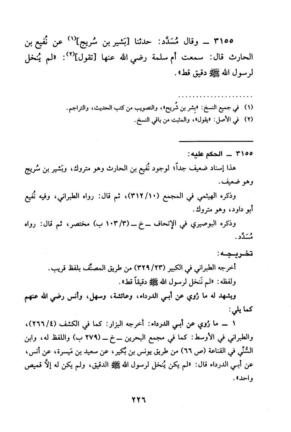 3155 - وقال مُسَدَّد: حدثنا [بَشير بْنُ سُرَيْجٍ] عَنْ نُفَيْعِ بن الحارث قال: سَمِعْتُ أم سلمة رَضِيَ الله عَنْها [تَقُولُ] : " §لَمْ يُنْخَلْ لِرَسُولِ اللَّهِ صَلَّى اللَّهُ عَلَيْهِ وَسَلَّمَ دَقِيقٌ قَطُّ ".