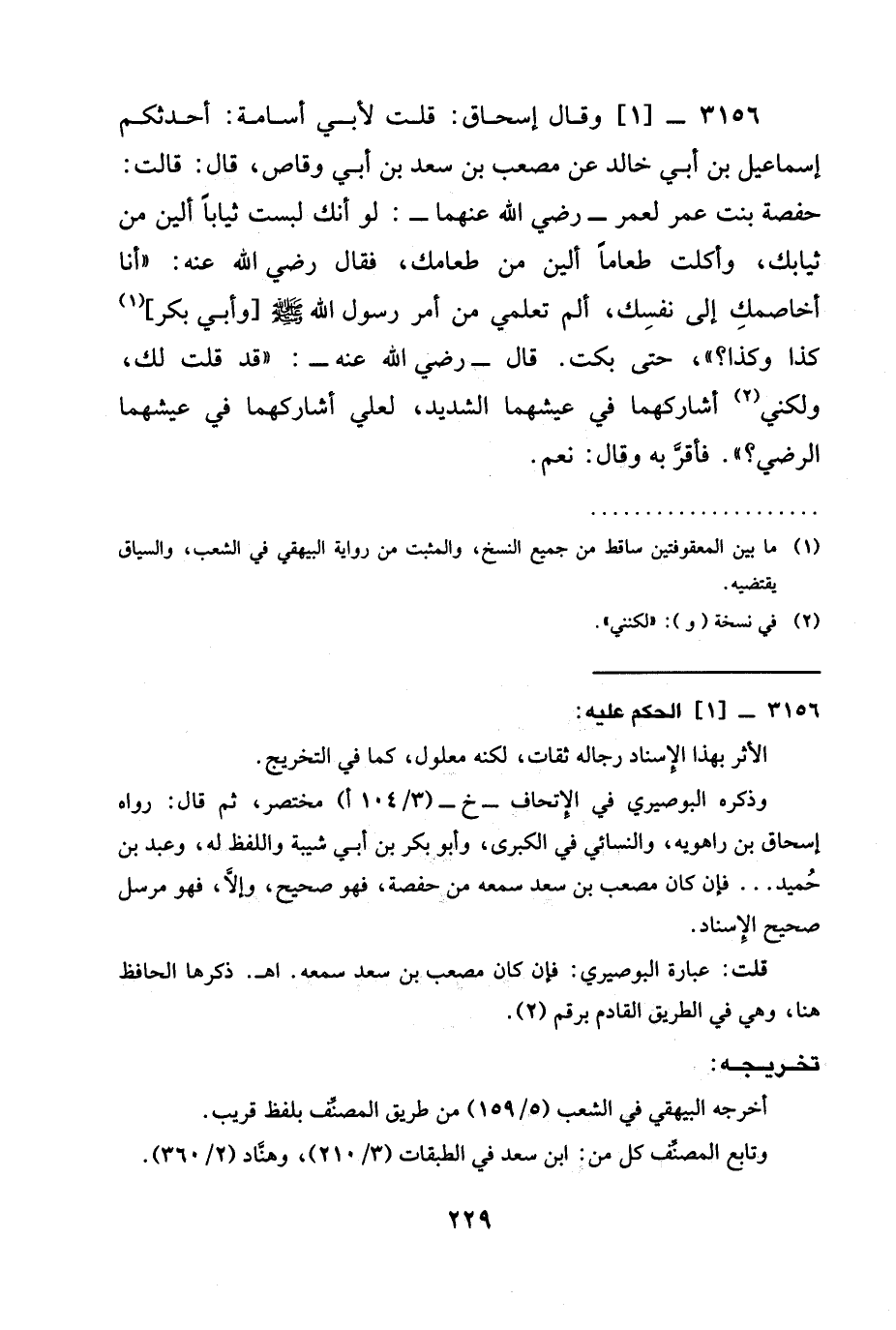 3156 -[1] وقال إِسْحَاقُ: قُلْتُ لِأَبِي أُسَامَةَ: أَحَدَّثَكُمْ إِسْمَاعِيلُ بْنُ أَبِي خَالِدٍ عَنْ مُصْعَبِ بْنِ سَعْدِ بْنِ أَبِي وَقَّاصٍ، قَالَ: قَالَتْ: حَفْصَةُ بِنْتُ عمر لعمر - رَضِيَ الله عَنْهما -: §لَوْ أَنَّكَ لَبِسْتَ ثِيَابًا أَلْيَنَ مِنْ ثِيَابِكَ، وأكلت طعاماً ألين مِنْ طَعَامِكَ، فَقَالَ رَضِيَ الله عَنْه: " أنا أُخَاصِمُكِ إِلَى نَفْسِكِ، أَلَمْ تَعْلَمِي مِنْ أَمْرِ رسول الله صَلَّى اللَّهُ عَلَيْهِ وَسَلَّمَ [وأبي بكر] كَذَا وَكَذَا "، حَتَّى بَكَتْ. قَالَ - رَضِيَ الله عَنْه -: " قَدْ قُلْتُ لَكِ، وَلَكِنِّي أُشَارِكُهُمَا فِي عَيْشِهِمَا الشَّدِيدِ، لَعَلِّي أُشَارِكُهُمَا فِي عَيْشِهِمَا الرضي؟ ". فَأَقَرَّ بِهِ وقال: نَعَمْ -[233]-.